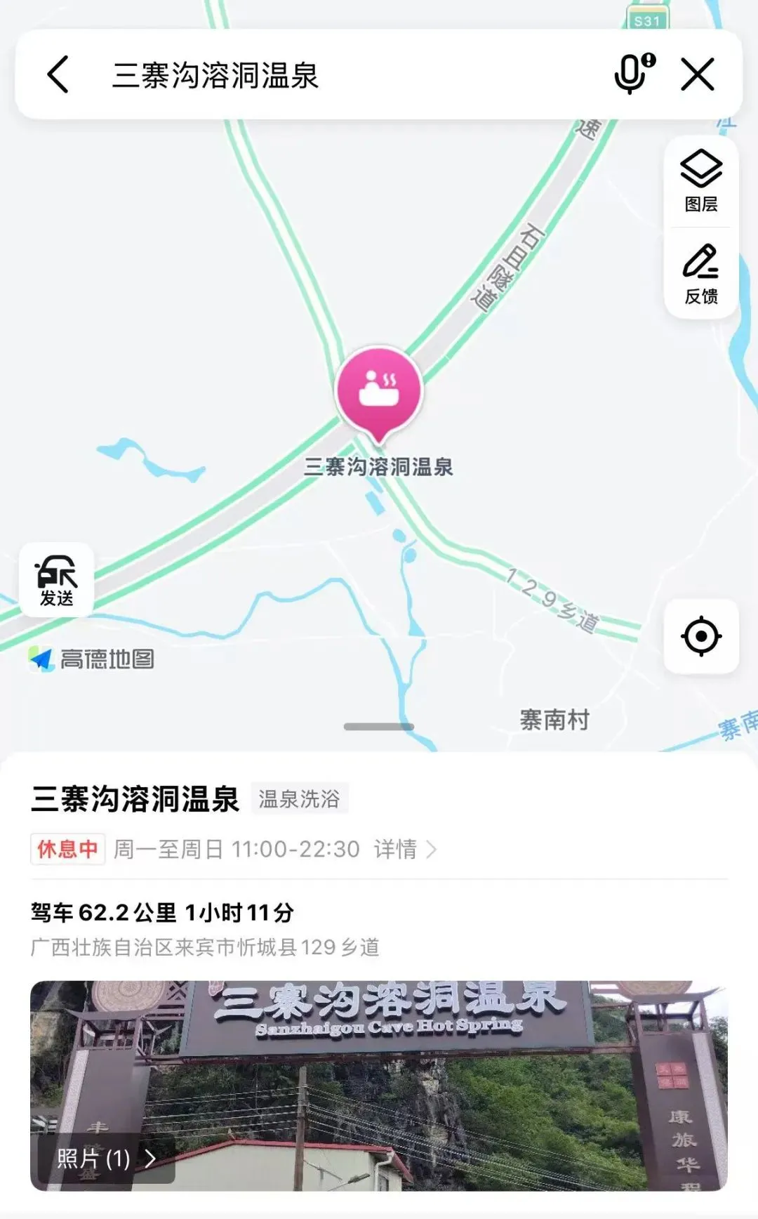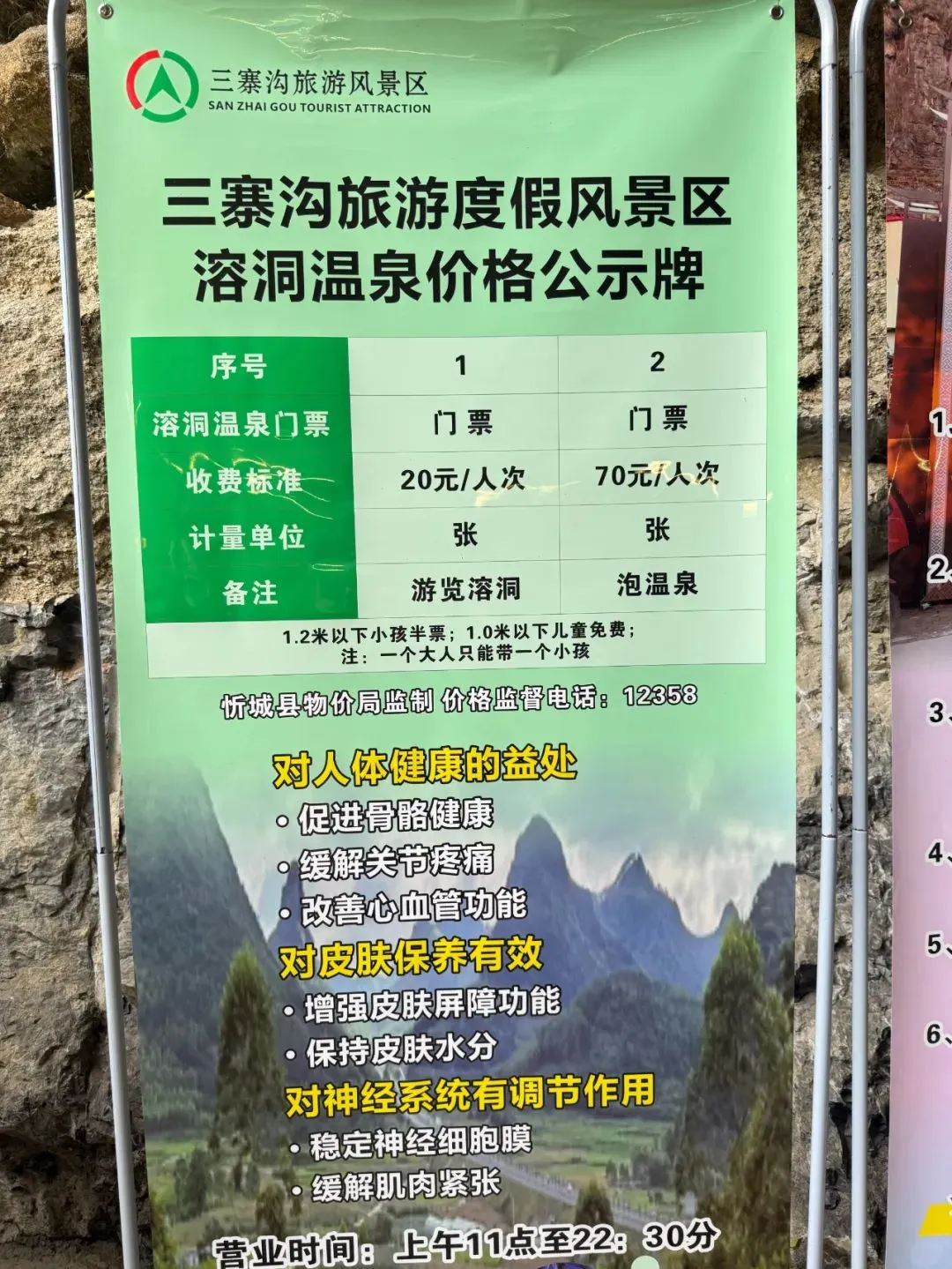 温泉简介:修建三柳高速路过三寨沟景区时,地下勘探地基的时候发现地下2千米处有热水,于是三寨沟景区就抽热水上来引到景区内的山洞里,建成了一个罕见的山洞温泉,温泉水在39度到42度之间,在山洞里面泡温泉是一种难得的体验,泡起来很舒服!泡完还可以游览三寨沟景区(不用门票),三寨沟地下水丰富,有多个闷水从地下涌出清甜干洌,还有田园风光,花卉种植基地等参观游览,当地还有各种本地特产出售,比如著名的忻城糯玉米头等!