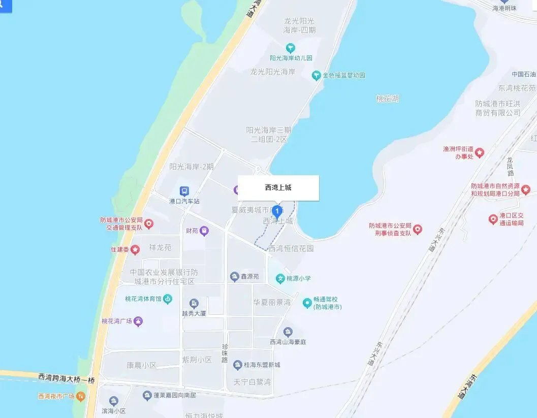 从位置来看,房子所在的小区西湾上城,在防城港市港口区,地段还是非常好的,除了有桃花湖外,小区距离桃花湾广场和防城港市伏波文化园也是非常近。附近有桃源小学、新大新购物广场等配套,周边居住小区也非常多,包括夏威夷城市广场、碧海紫金城、阳光海岸、西湾恒信花园等,常住人口还是非常多。