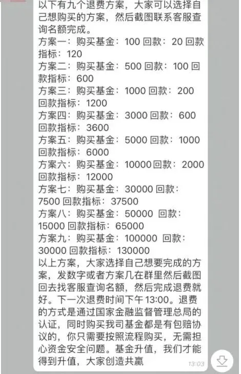 上海市民朱先生当时收到一个快递包裹,包裹内有一张落款为某教育机构的退费公告,并附有一个二维码。朱先生想到之前确实在网上办理过相关教育培训,便信以为真,扫码添加了“退款客服”的联系方式。“客服”称,之前的公司被一家基金公司收购了,所以现在提供的退款渠道只能通过购买基金增值的方式进行,并且还发送了伪造的营业执照打消其顾虑。随后,将信将疑的朱先生就在客服的指导下下载了一款金融理财App,并根据回款方案购买了基金。起初,朱先生购买了1000元的基金试水,很快1200元的回款就到账并顺利提现了,这让他彻底相信购买基金就能完成退费,于是分多笔往账户里充值了共计15000余元。正当朱先生收到回款准备提现时,平台显示需要等待24小时才能再次提现。第二天,当他准备提现时,发现原先的平台已无法进入,“客服”也消失无踪。这时朱先生才意识到自己被骗,随即报警求助。诈骗分子通过非法渠道获取个人信息后,将伪造的政府部门、公司、机构文件邮寄给受害人,以办理培训退费、投资退费为由,诱导其加入退费群。待受害人进群后,诈骗分子通过发送营业执照、工作证,营造多人成功退费的假象来获取受害人信任,实际上这些都是假的,群里的成员也都是“托”。以“购买理财产品退费”“充值返利”“做任务”等理由,引导受害人下载投资理财App,并在App上充值。在前期小额投资时,诈骗分子一般会如约支付收益,进一步获取被害人信任,诱导其加大投资。当受害人投入大额资金后,诈骗分子便以“操作失误”“账户冻结”“缴纳保证金”等理由拒绝提现,要求受害人继续投入资金,直到受害人发现被骗为止。所谓的退费,其实就是诈骗分子用于引流的幌子。请大家擦亮双眼,不要轻信来历不明的文件、包裹。正规退费流程一般以原路返还的形式返还给本人缴费账号,凡是退款时附加购买理财产品或支付费用条件的,都是诈骗!如有疑问,可及时拨打110或有关机构主管部门电话求证、求助。