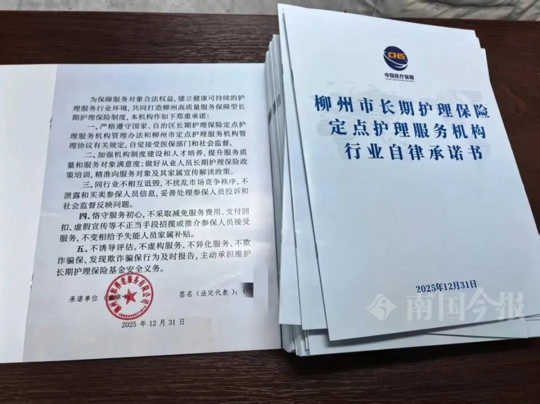 “为保障服务对象合法权益,建立健康可持续的护理服务行业环境,共同打造柳州高质量服务保障型长期护理保险制度,本机构作如下郑重承诺……”2025年12月31日上午,柳州市召开长期护理保险定点护理服务机构工作会议,数十家定点护理服务机构签署了《柳州市长期护理保险定点护理服务机构行业自律承诺书》。