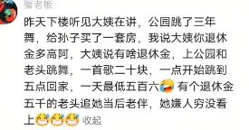 昨天下楼听见大姨在讲,公园跳了三年舞,给孙子买了一套房,我说大姨你退休金多高阿,大姨说有啥退休金,上公园和老头跳舞,一首歌二十块,一点开始跳到五点回家,一天最低五百六,有个退休金五千的老头追她当后老伴,她嫌人穷没看上。