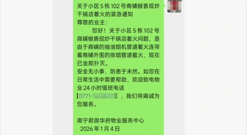 上午8点左右,南宁市青秀区龙光君御华府小区5栋的“椒香现炒干锅”餐饮店发生火情。