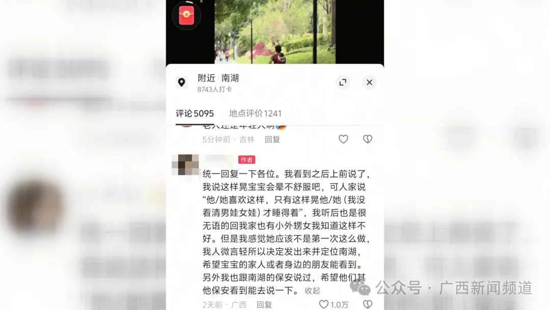 南宁一阿姨背着婴儿在南湖公园跑步,不停颠簸摇晃!热心市民劝阻遭怼: “孩子喜欢”!
