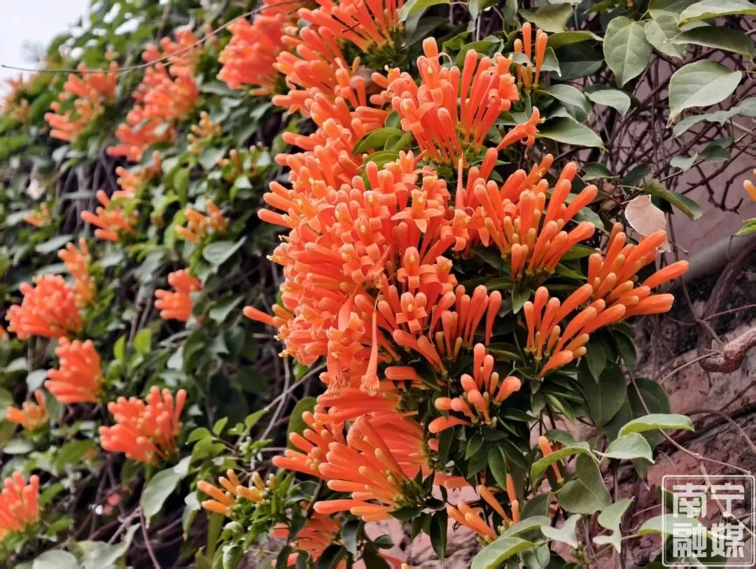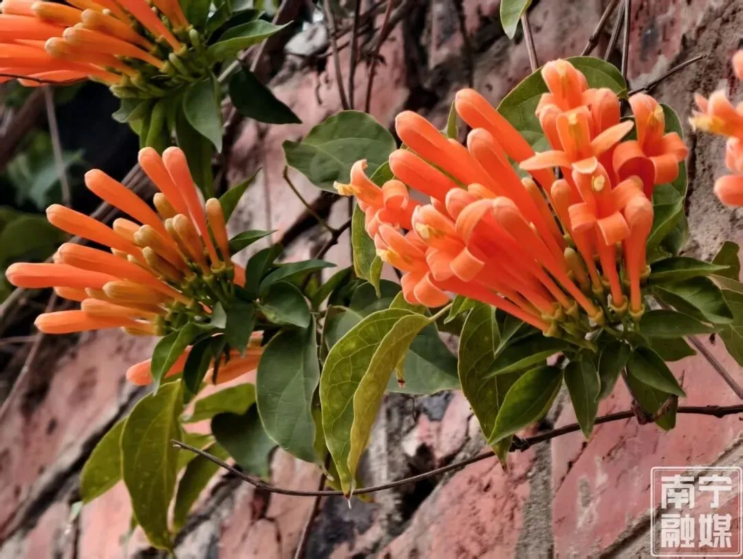 炮仗花原产于南美洲巴西,因花开形似炮仗而得名。由于生命力强,在南宁温暖湿润的气候加持下,只要有支架、廊架或者景墙,便能随意缠绕,成为城市街头一道亮丽的风景线。