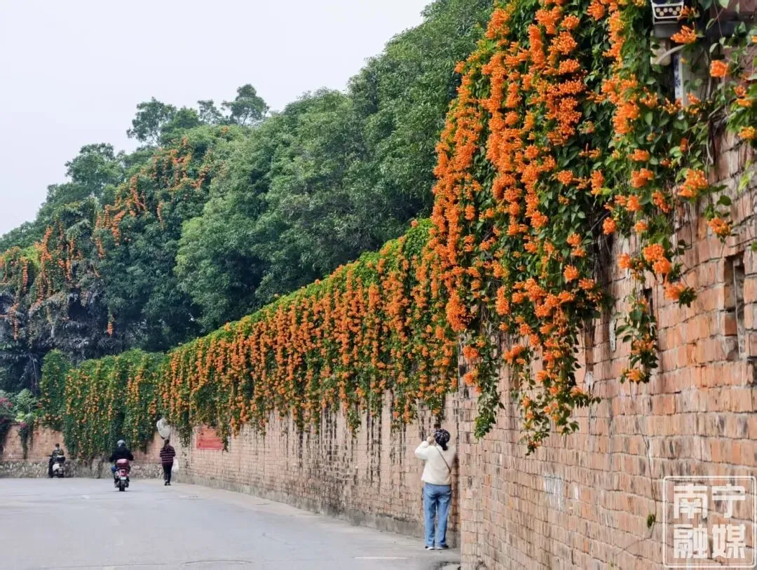 爬满院墙的炮仗花仿佛一串串鞭炮连成一片,给这座城市增添了一抹暖意的同时,也寓意着新一年红红火火。
