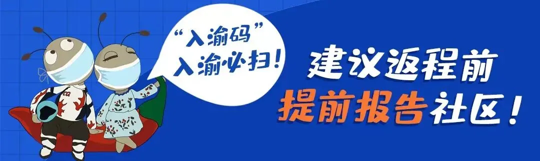 市外来渝返渝人员在各交通口岸查验通信行程卡后,均需按照指引扫描“入渝码”和“社区报告二维码”,在交通口岸就地或者就近开展1次核酸检测。“入渝码”弹窗期间,做好个人防护,不能参加聚餐活动,不能参加会议和商务活动,不能前往其他人员密集和空间密闭的公共场所。离渝人员要合理安排出行计划,不前往中高风险区所在的县(市、区、旗)。