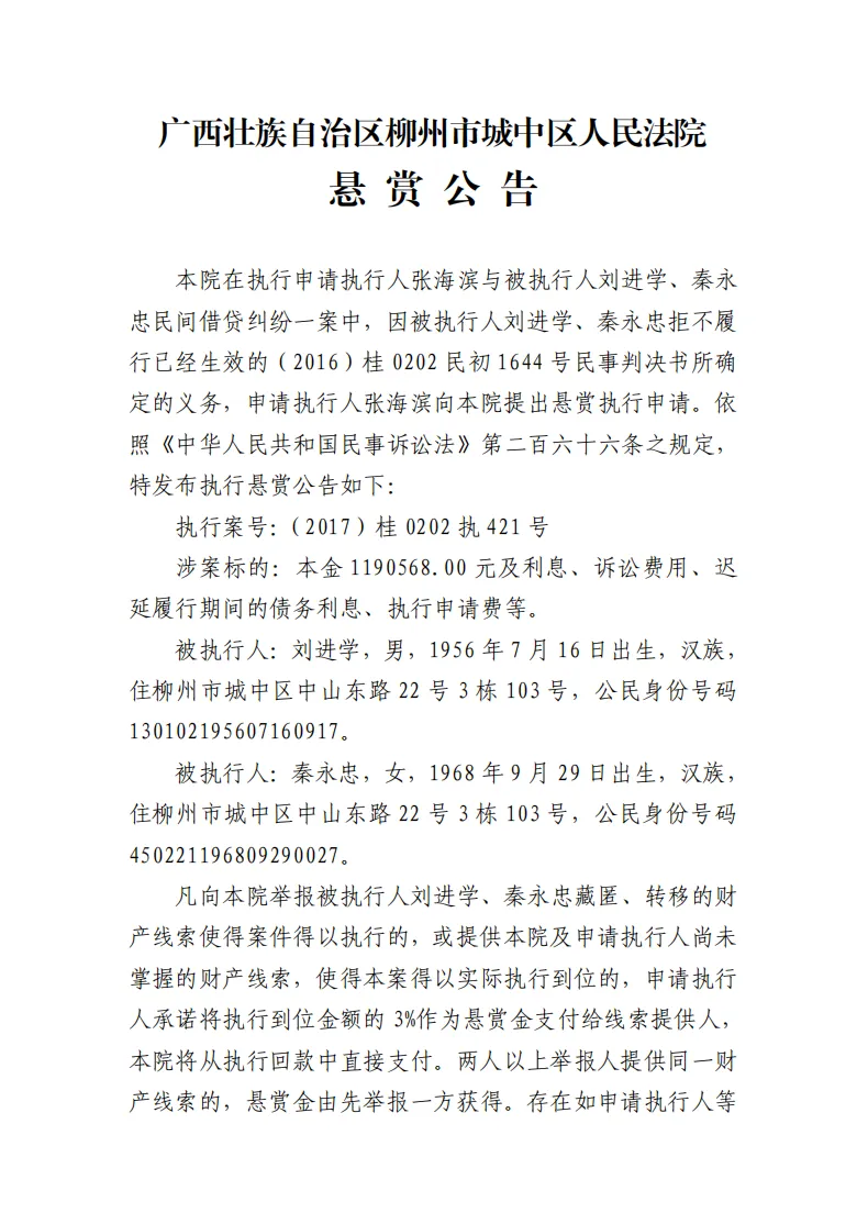 本院在执行申请执行人张海滨与被执行人刘进学、秦永忠民间借贷纠纷一案中,因被执行人刘进学、秦永忠拒不履行已经生效的(2016)桂0202民初1644号民事判决书所确定的义务,申请执行人张海滨向本院提出悬赏执行申请。依照《中华人民共和国民事诉讼法》第二百六十六条之规定,特发布执行悬赏公告如下: