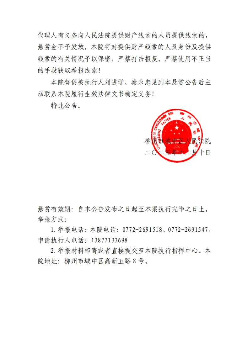凡向本院举报被执行人刘进学、秦永忠藏匿、转移的财产线索使得案件得以执行的,或提供本院及申请执行人尚未掌握的财产线索,使得本案得以实际执行到位的,申请执行人承诺将执行到位金额的3%作为悬赏金支付给线索提供人,本院将从执行回款中直接支付。两人以上举报人提供同一财产线索的,悬赏金由先举报一方获得。存在如申请执行人等代理人有义务向人民法院提供财产线索的人员提供线索的,悬赏金不予发放。本院将对提供财产线索的人员身份及提供线索的有关情况予以保密,严禁打击报复。严禁使用不正当的手段获取举报线索!