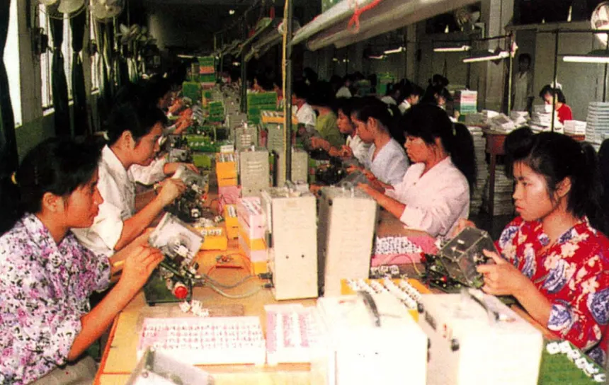 1984年11月3日,市丰德电子有限公司正式成立。由市无线电五厂与香港德燊电业有限公司合资经营。总投资99万美元,引进日本四联可变电容器生产线、生产技术和管理方法,生产可变电容器系列产品。时称广西首家中外合资电子工业企业。图为生产线一角 (图片来自《南宁开埠百年》)