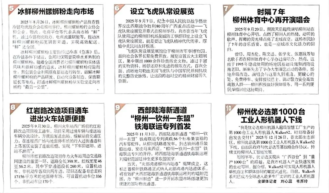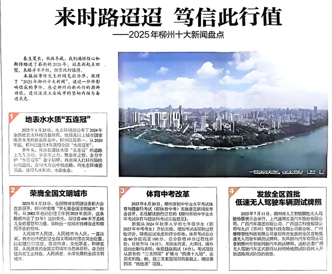 1月5日,《柳州日报》刊登《来时路迢迢 笃信此行值——2025年柳州十大新闻盘点》,红岩路改造项目通车和西部陆海新通道“柳州—钦州—东盟”铁海联运专列首发双双入选2025年柳州十大新闻。