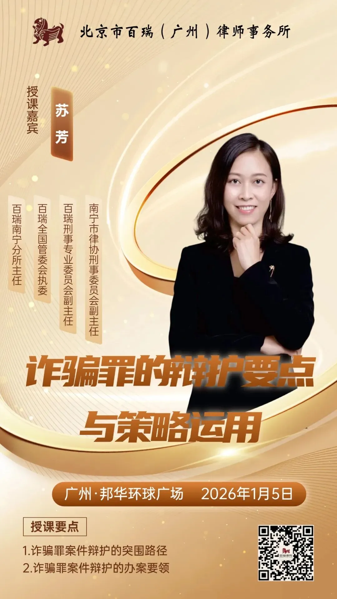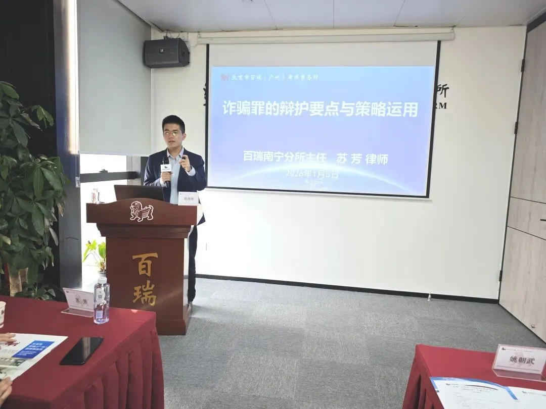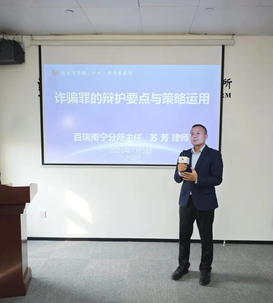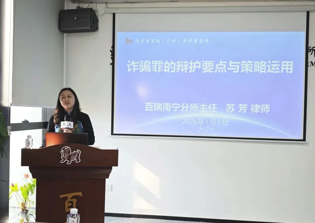 1月5日下午15时许,在北京市百瑞(广州)律师事务所(以下简称“百瑞广州分所”)多功能厅,本所邀请北京市百瑞(南宁)律师事务所(以下简称“百瑞南宁分所”)苏芳主任到访,并做题为《诈骗罪的辩护要点与策略运用》专题授课,为广州分所的百瑞律师带来一场理论与实践深度融合的专题讲座。