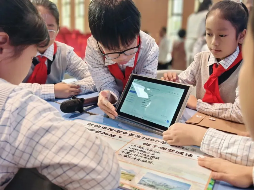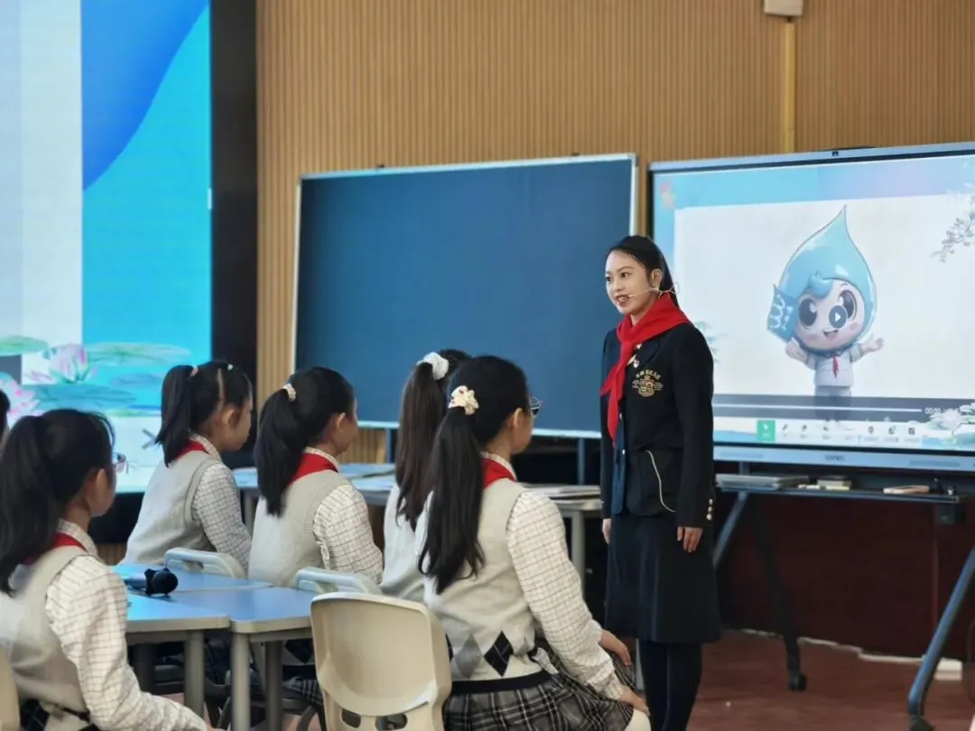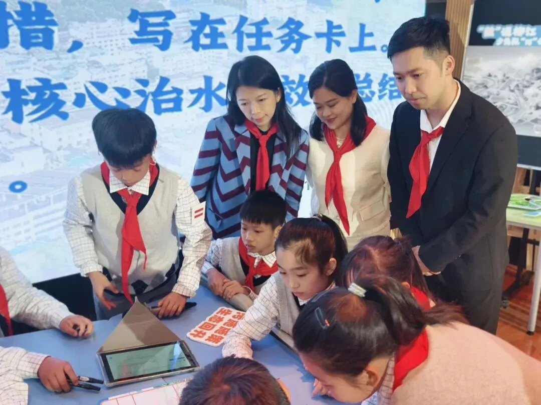 活动伊始,柳州市弯塘小学教育集团呈现两场高质量队课展示,充分体现柳州少先队活动“扎根本土、贴近队员、注重实践”的特色。覃槟槟老师执教的《“数”说柳江,“水”与争锋》队课,以时间为轴梳理柳江从“酸雨之都”到水质“五连冠”的蝶变历程。各小队通过项目式学习探究柳州治水“加减法”,结合水质过滤实验、AI智能体数据呈现、歌谣朗诵与护河故事分享,使生态保护理念深入人心,并催生富有创意的解决方案。