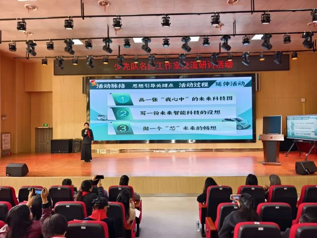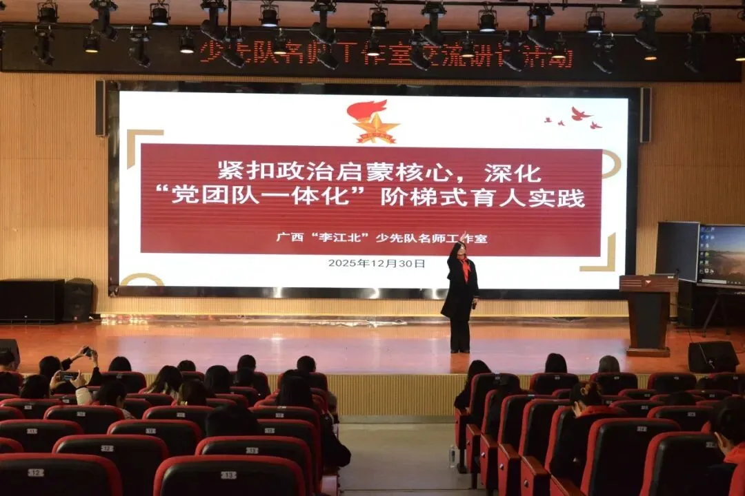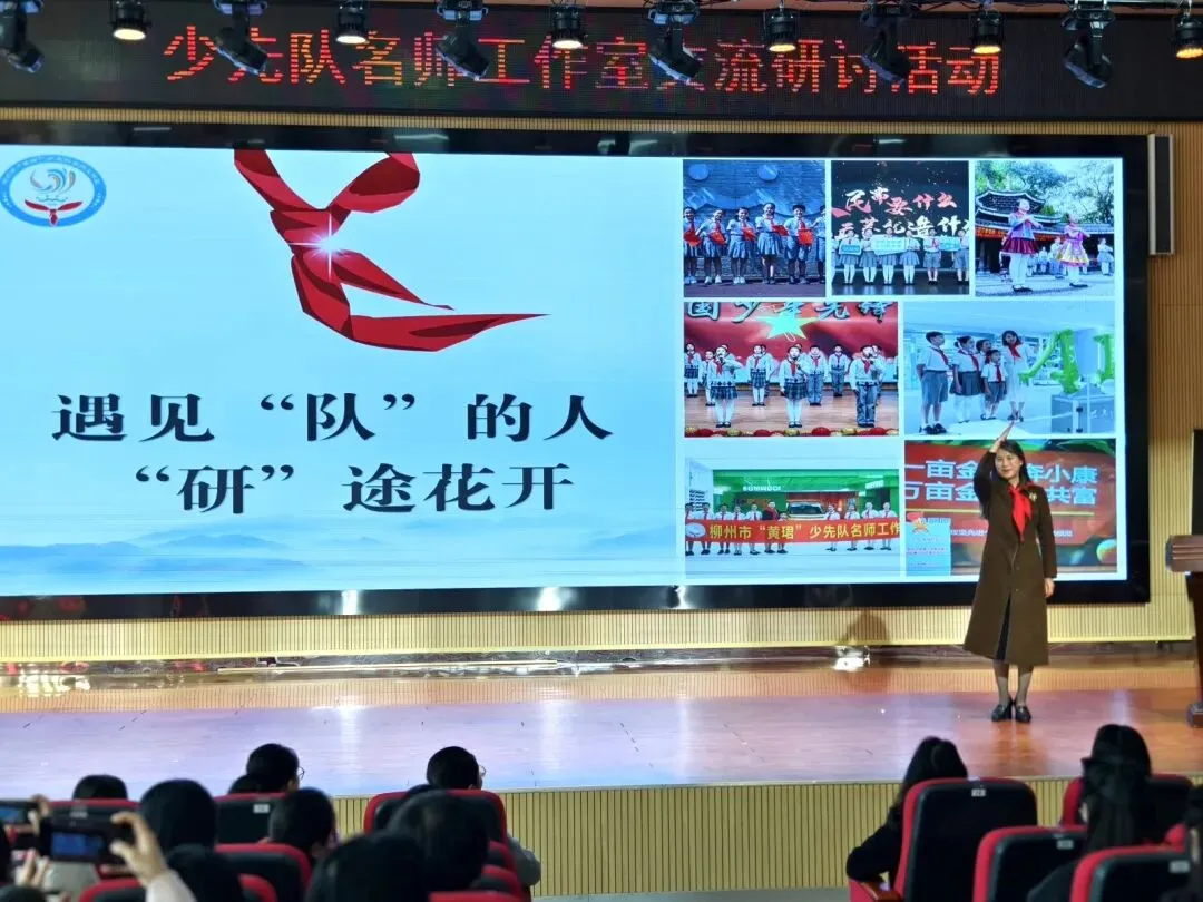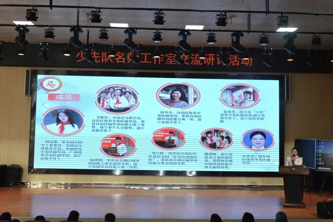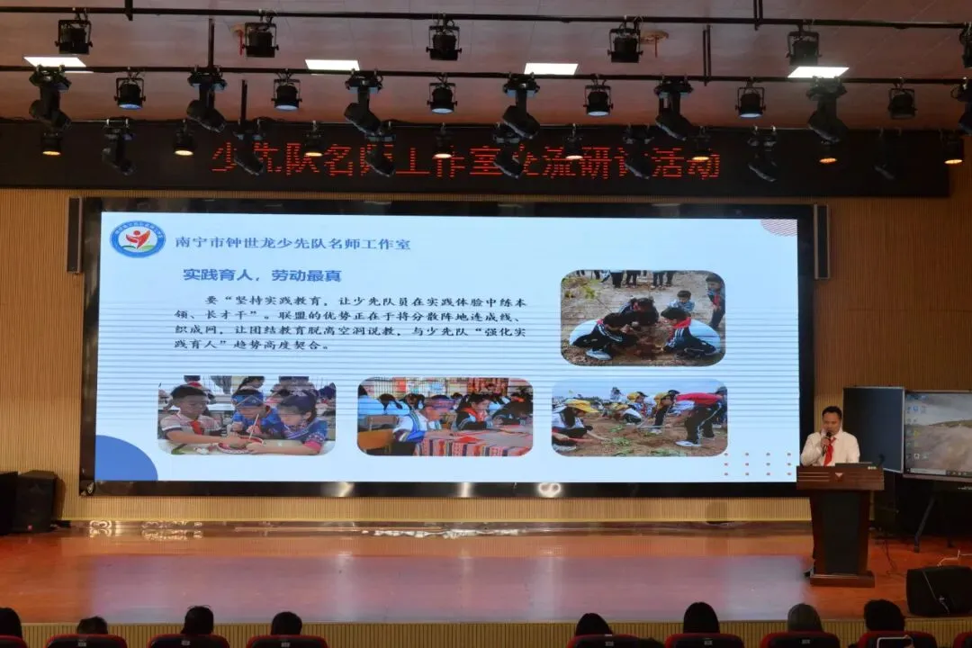 在经验交流环节,南宁、柳州两地11个少先队名师工作室带头人及骨干成员分享育人经验。其中,柳州市黄珺少先队名师工作室负责人黄珺书记坚守并创新少先队工作35年,其带领的23名骨干成员团队以“辅导员成长共同体”为宗旨,走出“多室联动、共修同研”特色发展之路。工作室创新建立线上线下结合的学习机制,联动校外实践阵地,秉持“压担子促成长”理念取得显著成效,在创新思政模式、开展红领巾宣讲、推进“科研兴队”等方面形成可复制推广成果,黄珺书记成为青年辅导员学习的榜样。