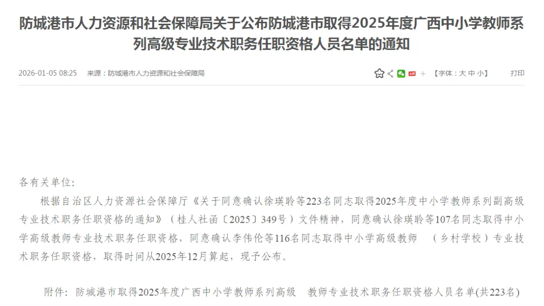 | 玉林市人社局 | 2025年玉林市中小学教师系列高级职称评审通过人员名单公示 |