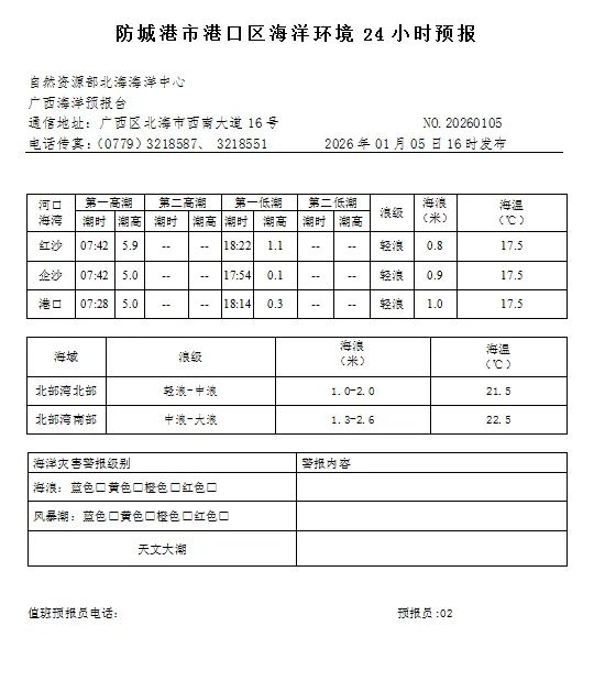 >2026年1月5日防城港市港口区海洋环境24小时预报