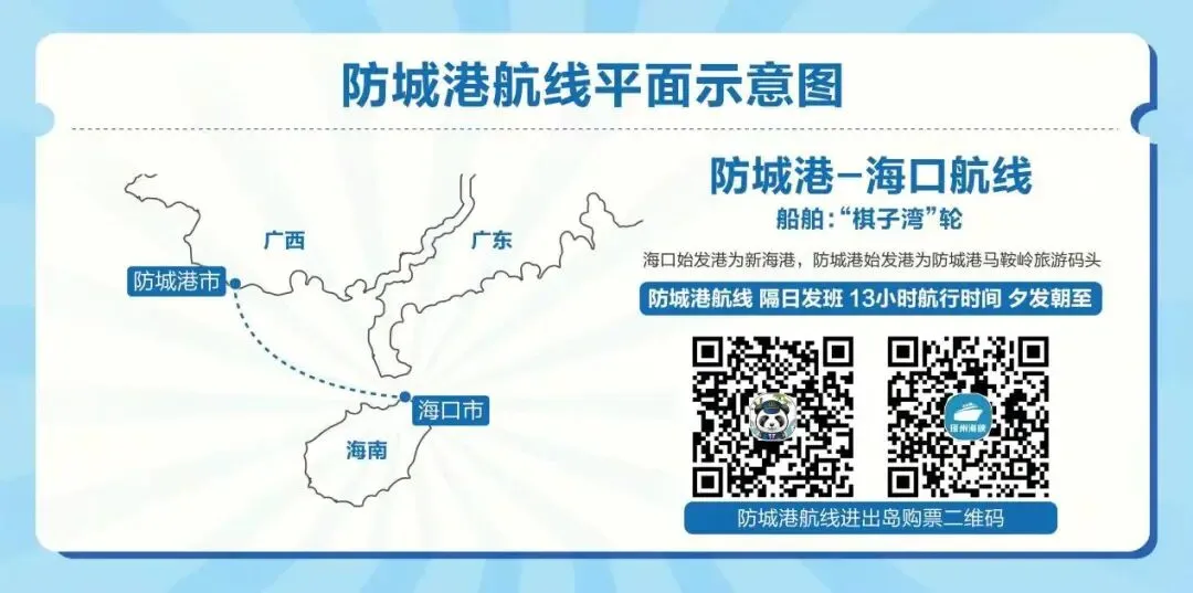 预订:扫描下方二维码提前通过官方渠道购买船票,这个冬天,告别绕行与等待,选择防城港往返海口航线,乘“棋子湾”轮穿越北部湾,在25℃的椰风里解锁属于你的海岛奇遇~