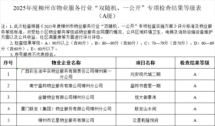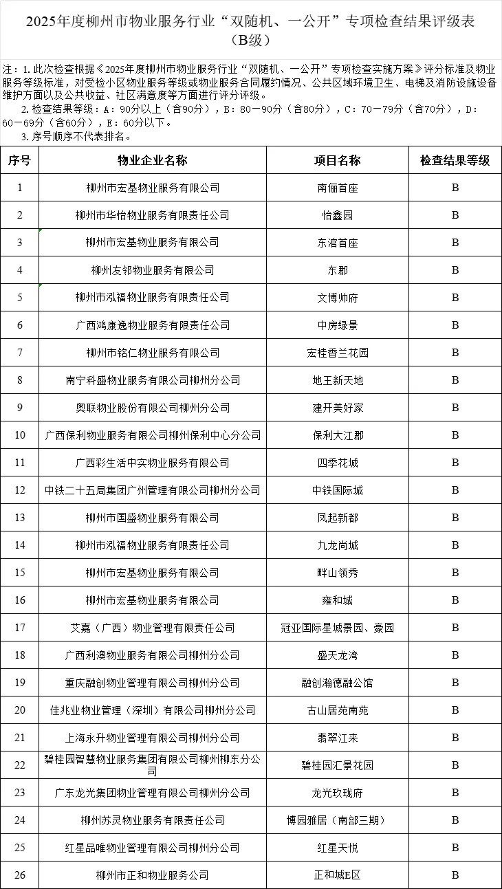 物业服务做得好不好,关乎小区业主日常生活的品质与便利程度。市住房和城乡建设局根据《广西壮族自治区物业管理条例》有关规定,开展2025年度柳州市物业服务行业“双随机、一公开”专项检查工作,并于近日通报了检查结果,将对此次检查结果为E级的16个小区物业服务企业实行重点监管,对拒不整改或未按要求落实整改的,依法移交相关行政执法部门,由其在法定权限内依据有关规定予以查处。