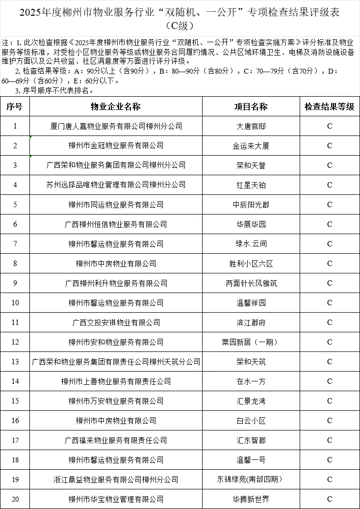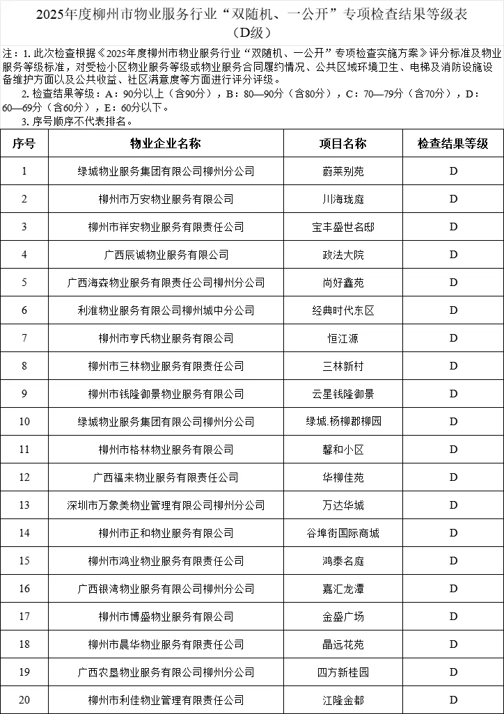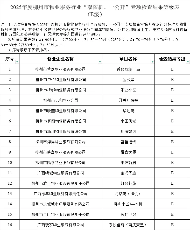其中,评为E级的有屏山小区1—21栋(柳州市众城城市环境服务有限公司)、金润华庭(广西精诚物业服务有限公司)、金水岸(柳州市中侨物业服务有限公司)等。对检查结果为E级的小区物业服务企业纳入重点检查和监督范畴,同时在指导小区业主大会选聘、续聘物业服务企业时,对于检查结果评为E级的物业服务企业建议不予考虑。