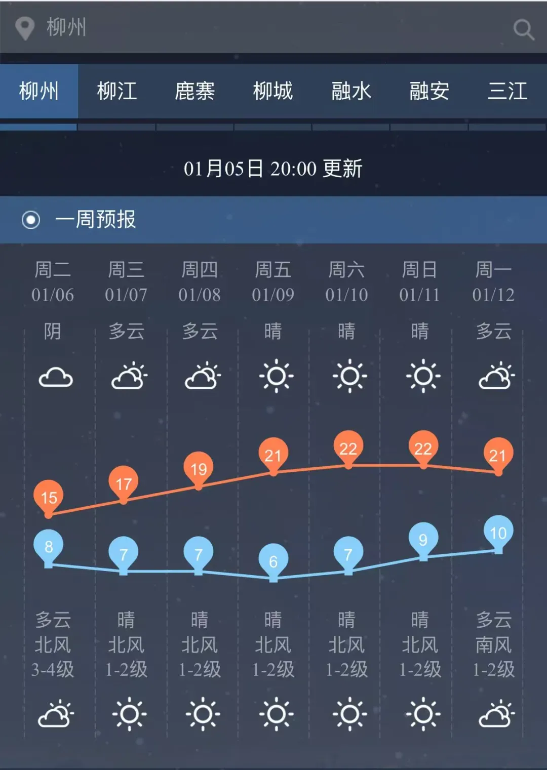 8日—9日,全市晴间多云,北部和高寒山区有霜冻或冰冻,北风1~2级,最低气温2~8℃,最高气温14~19℃。