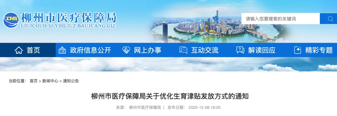 2025年12月5日,柳州市医疗保障局发布通知,已按规定参加该市生育保险的职工(国家机关、属财政全额拨款的事业单位和群团机关等用人单位的女职工除外),符合生育津贴申领条件的,可由职工本人或所在用人单位经办人申请,经医疗保障经办机构审核通过后发放至职工本人银行账户。