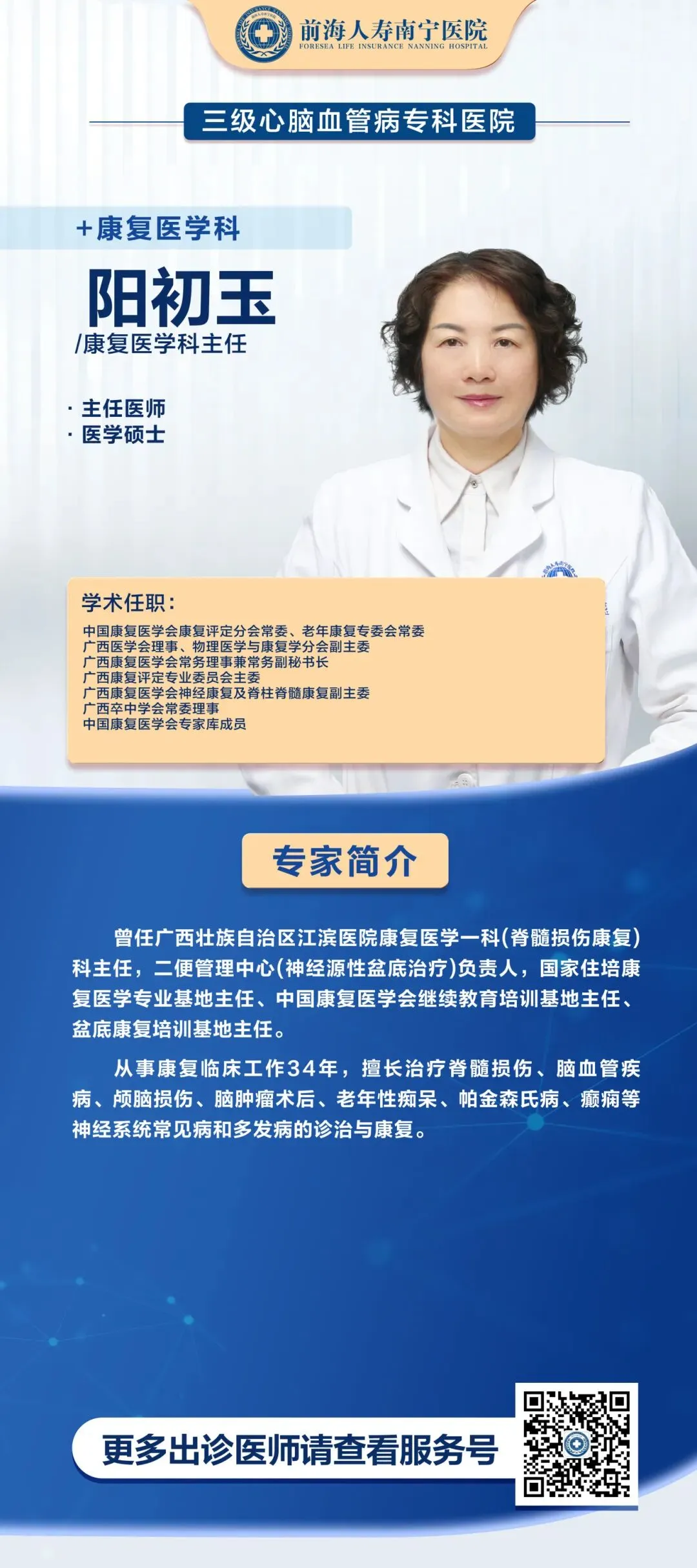 前海人寿南宁医院康复医学科目前设有门诊、病房和治疗中心,建筑面积达2000㎡。康复医学科拥有一支专业的医疗队伍,其中主任医师1名、副主任医师1名主治医师3名、住院医师2名,专业覆盖神经康复、骨关节及运动损伤的康复、疼痛康复、心肺康复、肿瘤康复等多个亚专业。擅长运用综合康复方法治疗脊髓损伤、脑卒中、各种颅内肿瘤及感染性疾病等导致的运动功能、言语功能、吞咽功能、膀胱功能、直肠功能、情感障碍、意识障碍等的康复。