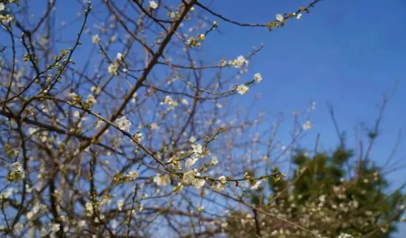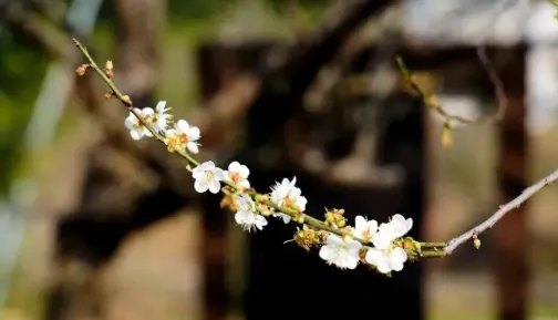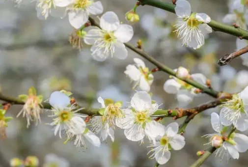 青梅花开,枝头缀花,有的含苞待放如羞涩少女,有的全然绽放似灿烂笑脸。光线穿过那半透明的花瓣,将那极淡的粉晕染成一片朦胧的光雾,花瓣的脉络纤细如命运的掌纹。花心托着细密的蕊,点点鹅黄,娇柔又矜贵。