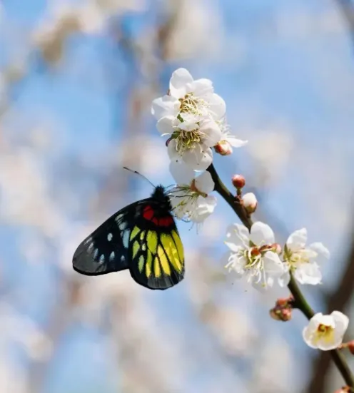梅花傲立枝头,开得正艳迎着冬日暖阳,有的梅花娇羞地半开半合。有的则肆意怒放、招蜂引蝶。呈现出一片繁花似锦的美景。来到这里登高望远,在名山的青山绿水间赏梅探春。感受冬日里的限定浪漫