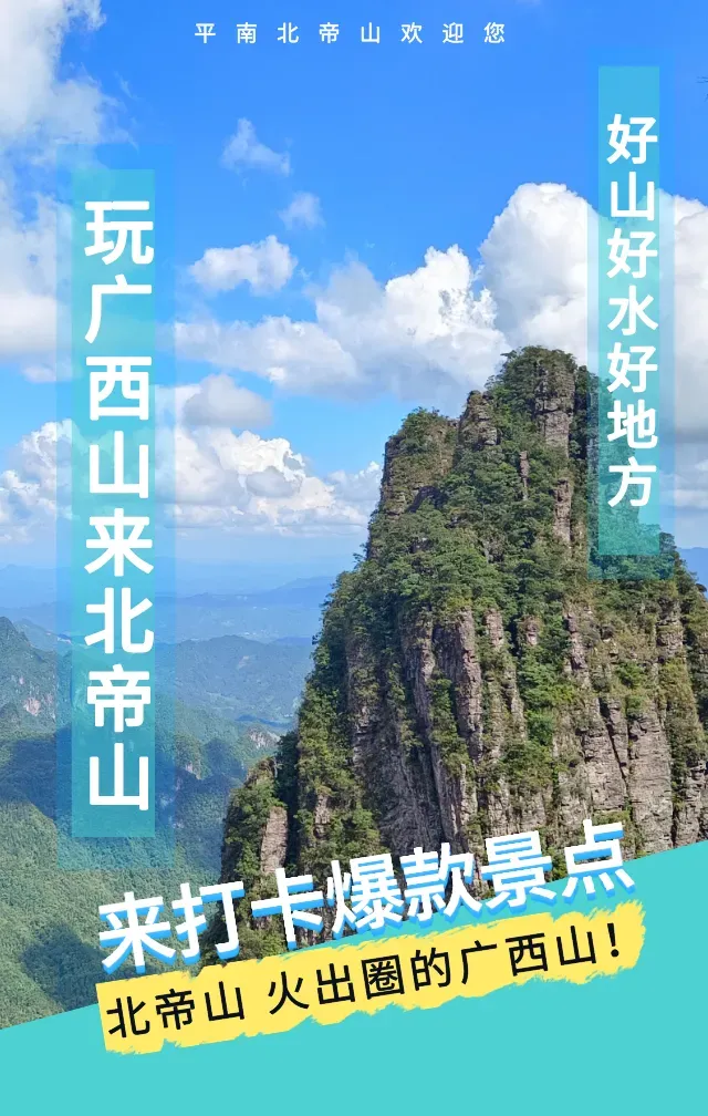 11:30【北帝山旅游风景区】国家AAAAA级旅游胜地,北帝山旅游区位于广西贵港市平南县大鹏镇,地处大瑶山南麓,森林覆盖达85%,年平均温度18.9℃,境内山清水秀,景色怡人,以峰秀、林茂、石奇、花艳、泉清、雾仙“六绝”闻名,奇、秀、雄并存,幽、静、艳齐聚。主要旅游资源有:北帝群峰、十里画廊、石桥壁墙、北帝揽胜、思灵瀑布等。