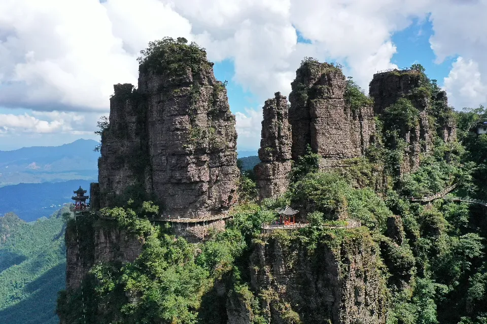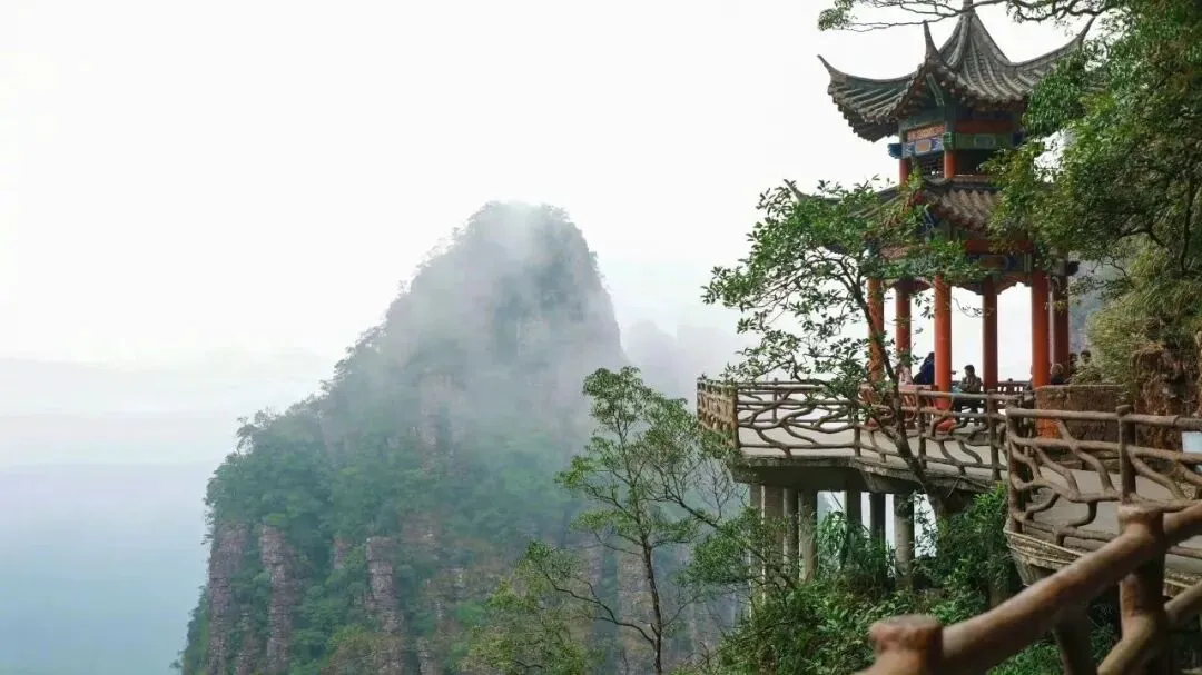亭台楼阁、奇峰怪石、古藤老树、苍茫云海,