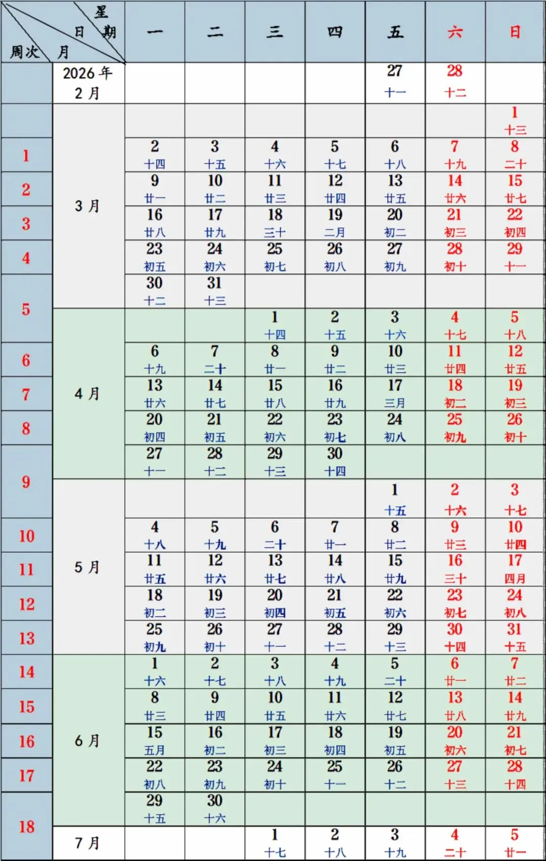 寒假:2026年1月12日-2月27日,共7周。