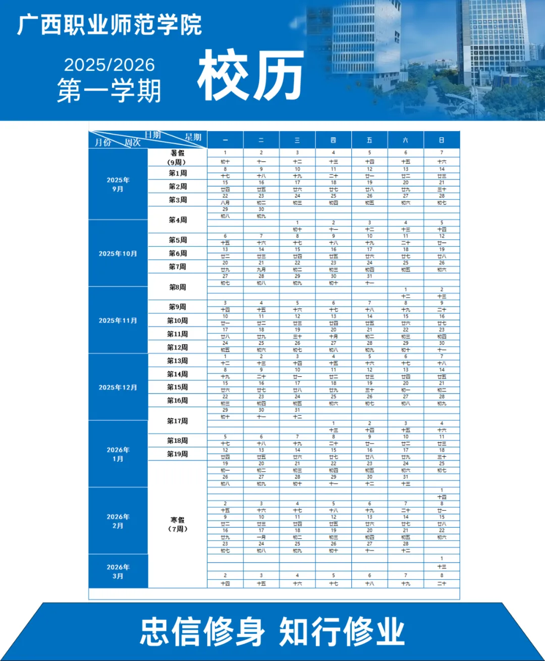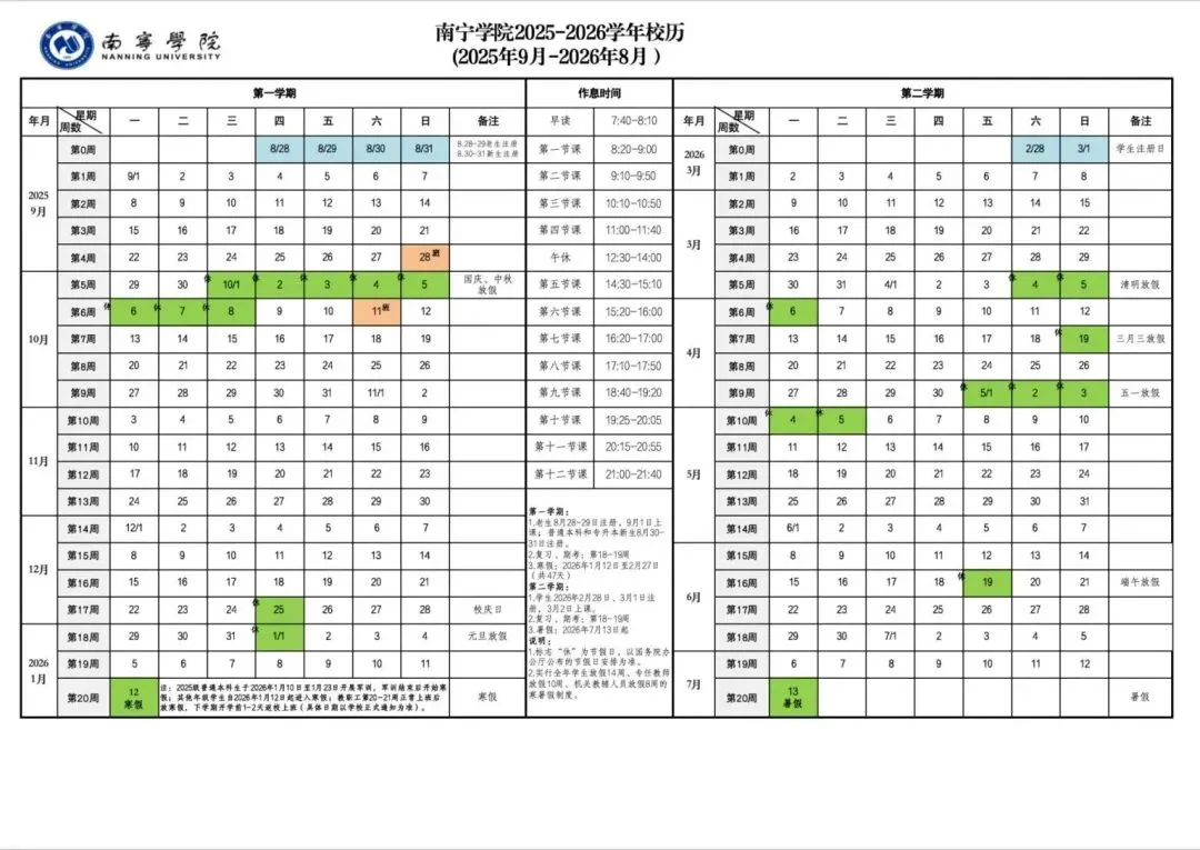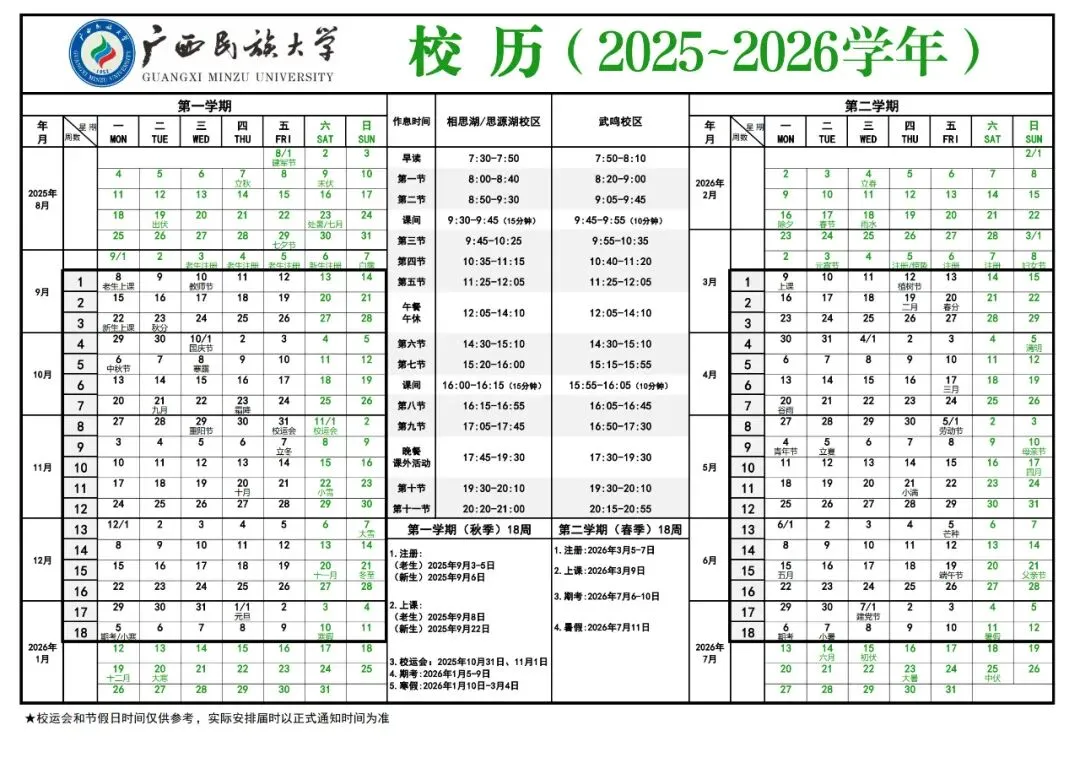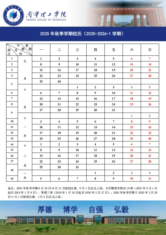 寒假7周(2026年1月10日起至2026年2月27日)。2026年春季学期于2026年2月28日-3月1日报到注册,3月2日正式上课。