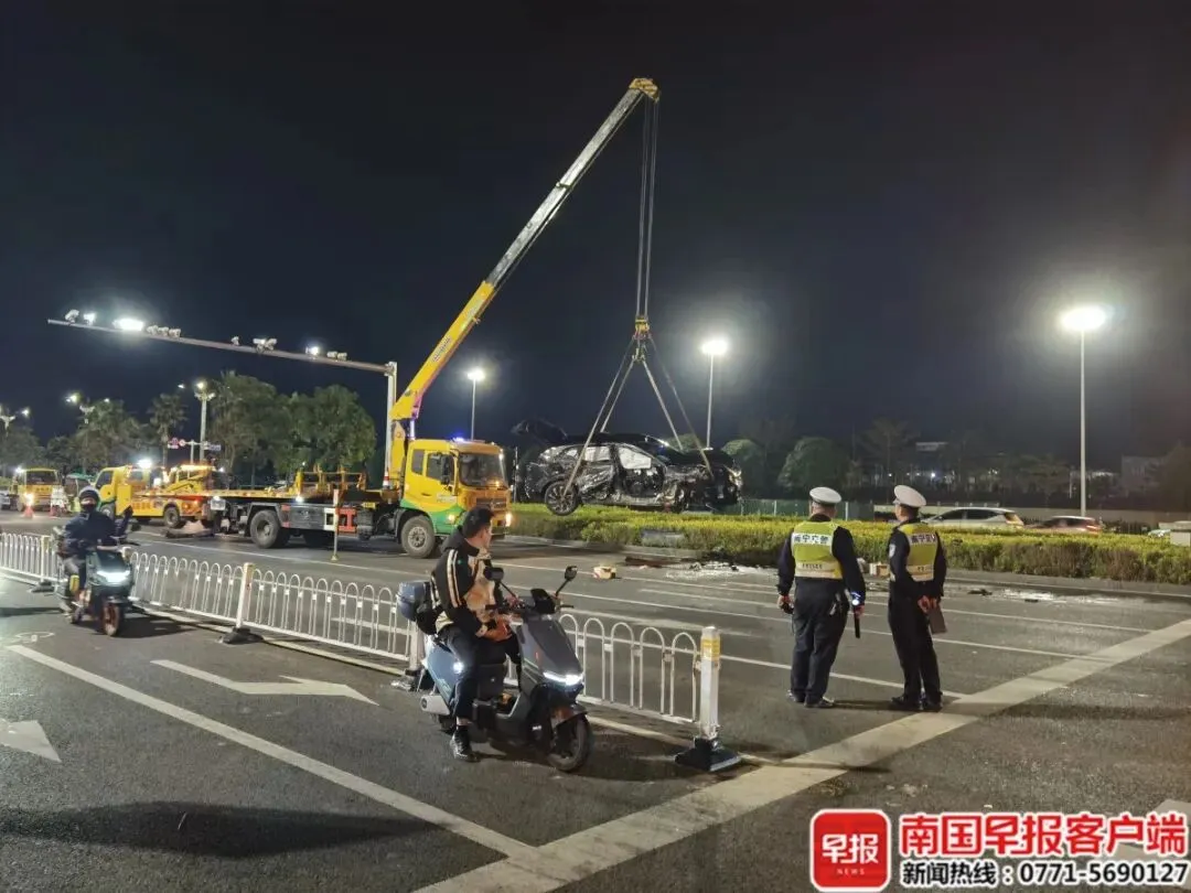 6日晚8时许,五象大道由东往西方向的5个车道已被封了4个车道,不少交警正在维护交通秩序。在十字路口,有一辆吊车正在起吊被撞坏的车辆,还有多名清洁工正在清洗道路。
