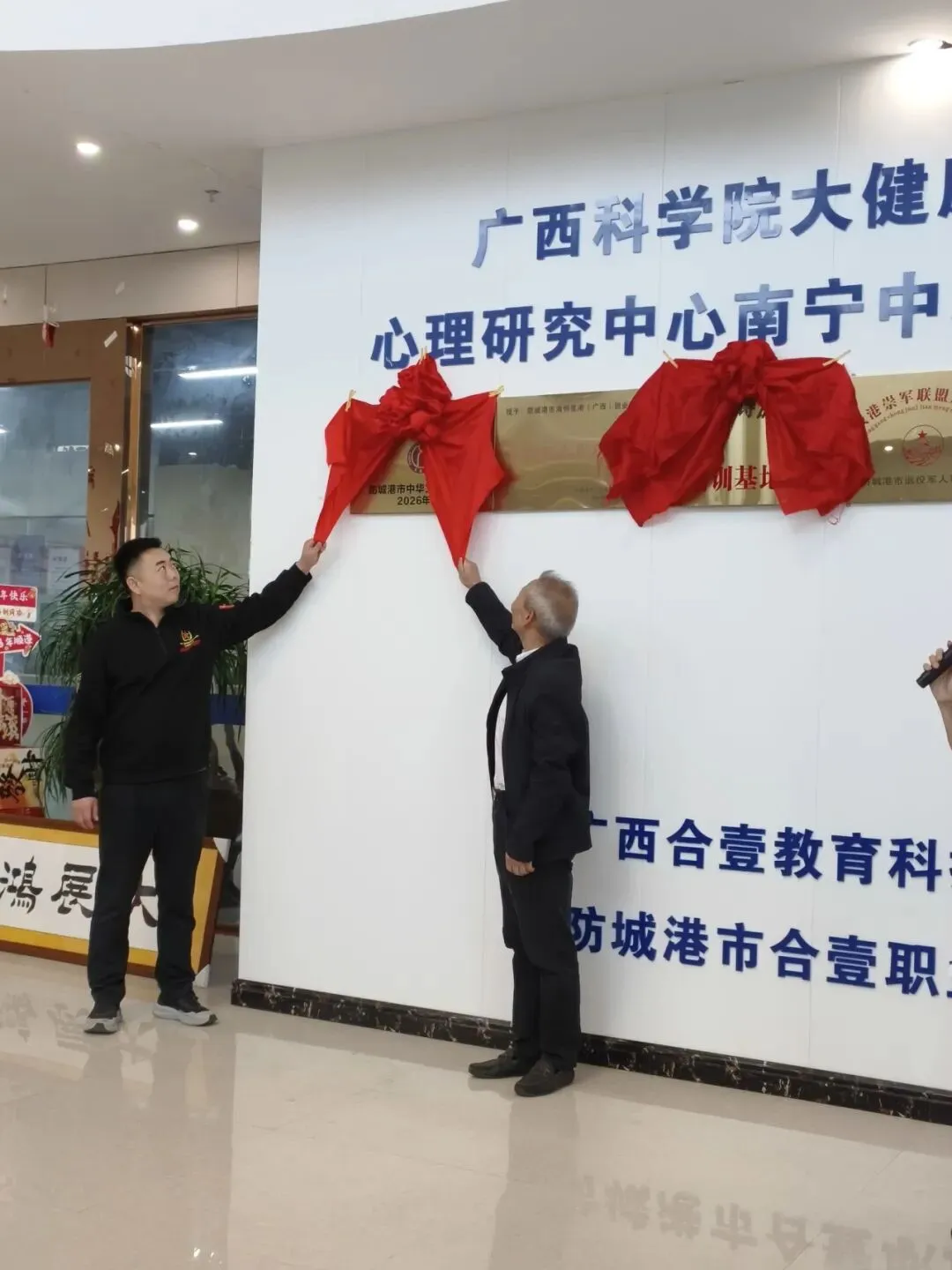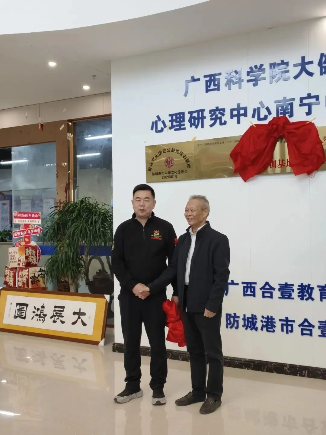 2026年1月6日上午10点18分,一个寓意着“一路发展”的吉时良辰,在各界来宾的共同见证下,防城港市中华文化促进会群众文化活动公益性培训基地,于海创星港(广西)创业孵化有限公司(以下简称“海创星港公司”)正式揭牌成立。市文促会副主席刘少先,秘书长庞淑玲,海创星港公司董事长张光磊、总经理张生、副总经理陆珊珊等出席揭牌仪式。