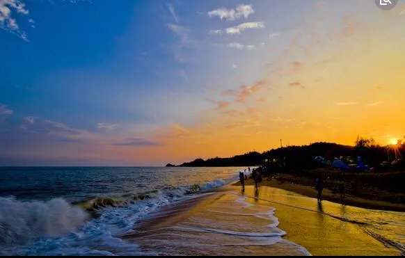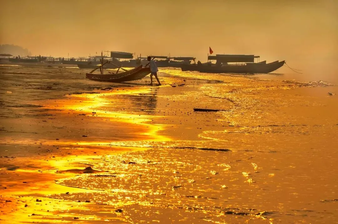 万尾金滩是京族三岛的绵长海滩,因沙质金黄,日落时分在阳光的照耀下显得金光闪闪而闻名。这里沙滩平缓,海水清澈,相比北海银滩,显得更为清静与原生态。纯天然的沙滩延绵数十里,站在金滩上,迎着海风、隔着蔚蓝色的海水,可以遥望西南方向水天一色的越南海景。