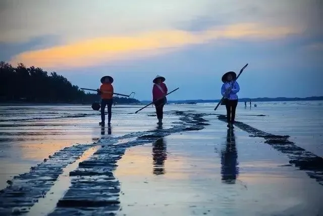 沙滩耙螺,海边的居民都很熟悉,退潮时用工具耙开沙滩,海螺就被耙出。而朝霞之下,耙螺留下的印记线条,也造就了万尾金滩上美妙的韵律感。