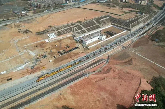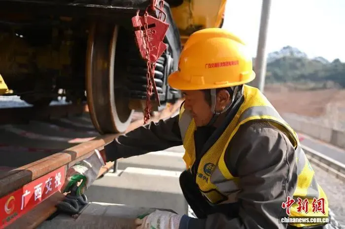 1月6日,在广西梧州市的柳州至广州铁路柳州至梧州段(以下简称“柳梧铁路”)铺轨施工现场,作业人员熟练地操控着中国自主研发的CPG500型铺轨机组,平稳精准地将一对500米长钢轨铺设到线路上,标志着柳梧铁路正式进入全线铺轨阶段。