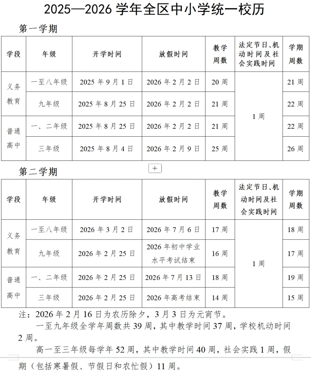 义务教育学校于2026年2月2日(星期一,农历腊月十五)起放寒假;