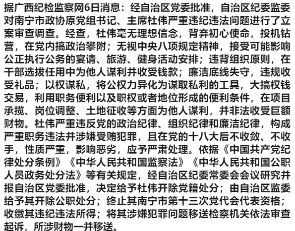 >南宁杜伟被“双开”!