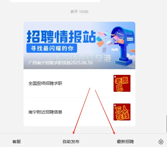 大家下午好,欢迎来到南宁便民信息港微信公众号,本公众号每天为大家分享免费优质的广西区内各大行业招聘信息资源,涵盖餐饮的总厨,经理,服务员,中西面点,粤菜,桂菜,川菜,湘菜炒锅,烧烤师,西餐,泰菜以及家政、家教、装修、安保、保洁、维修、搬运工、临时工、钟点工等职务岗位。资源每天更新,由于公众号推送机制变化,请将本公众号设为☆置顶标星标☆方便大家每次资源更新都能第一时间收到! 需要发布[商铺转让,档口招商、活动推广].招聘、求职、编辑好相关内容私发给我微信,您的信息将群发至广西招聘信息群;近万人长期在线上,人才招聘、活动推广、找工作都能快人一步感谢大家关注!