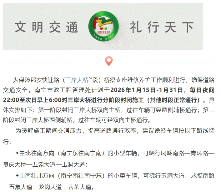 2026年16日,“南宁交警”官微发布提示,具体如下:南宁市政工程管理处计划于2026年1月15日—1月31日,每日夜间22:00至次日早上6:00对三岸大桥进行分阶段封闭施工(其他时段正常通行)。具体安排如下:第一阶段封闭三岸大桥双向主桥,过往车辆可经两侧辅桥通行;第二阶段封闭三岸大桥两侧辅桥,过往车辆可经双向主桥通行。为缓解施工期间交通压力,提高道路通行效率,建议途经车辆按以下路线绕行:由北往南方向(南宁东往南宁南)的小型车辆,可绕行凤岭南路—青环路—良庆大桥—五象大道—玉洞大道;由南往北方向(南宁南往南宁东)的小型车辆,可绕行玉洞大道—永福南路—五象大道—龙岗大道—蓉茉大道。(via 南宁交警)