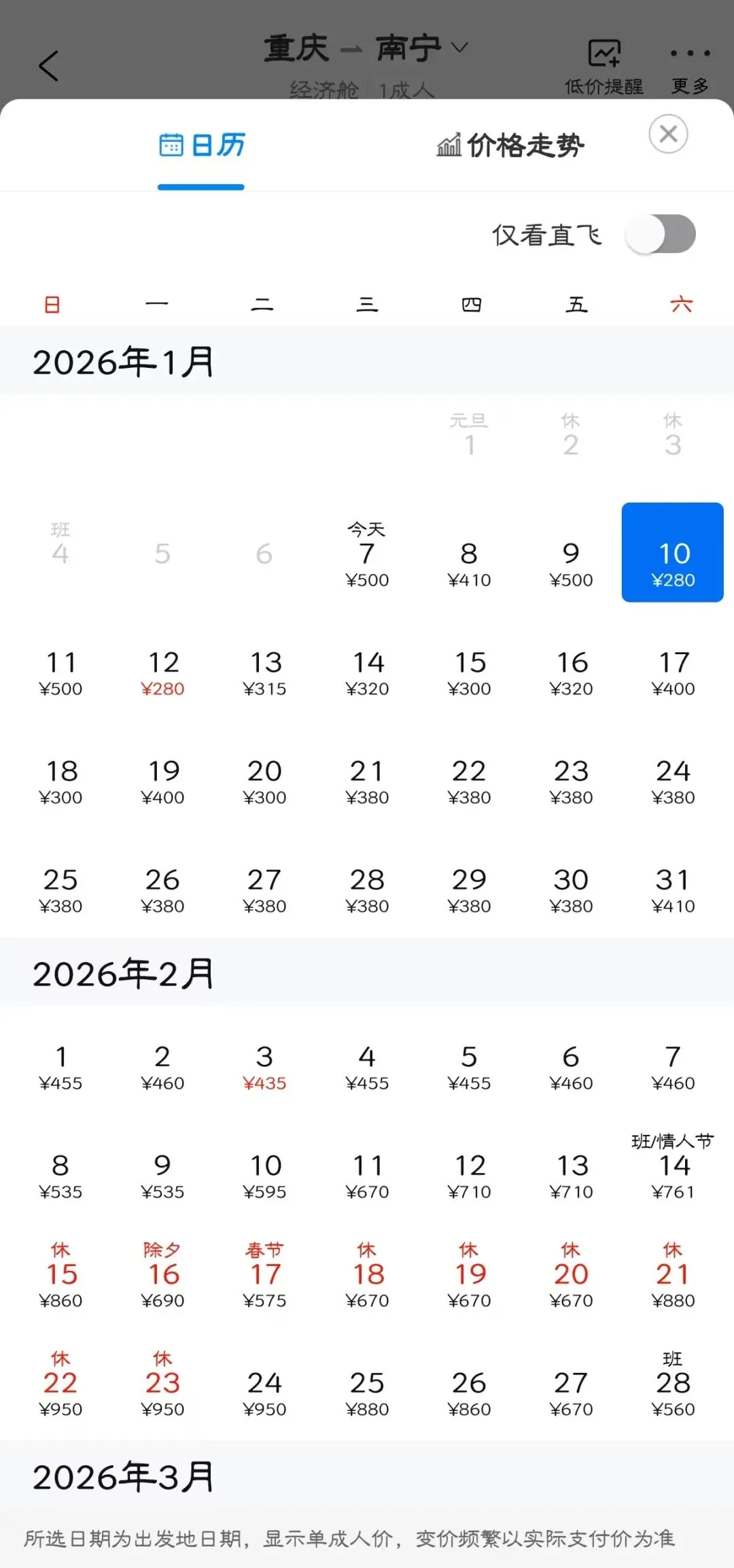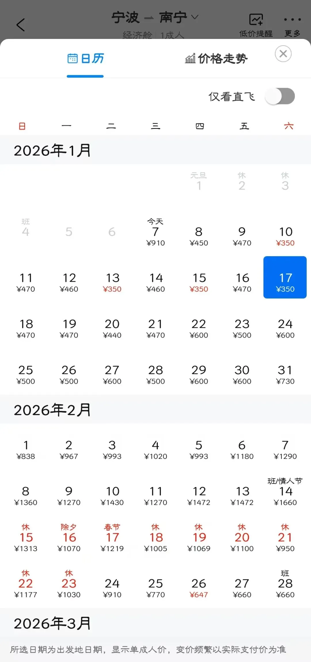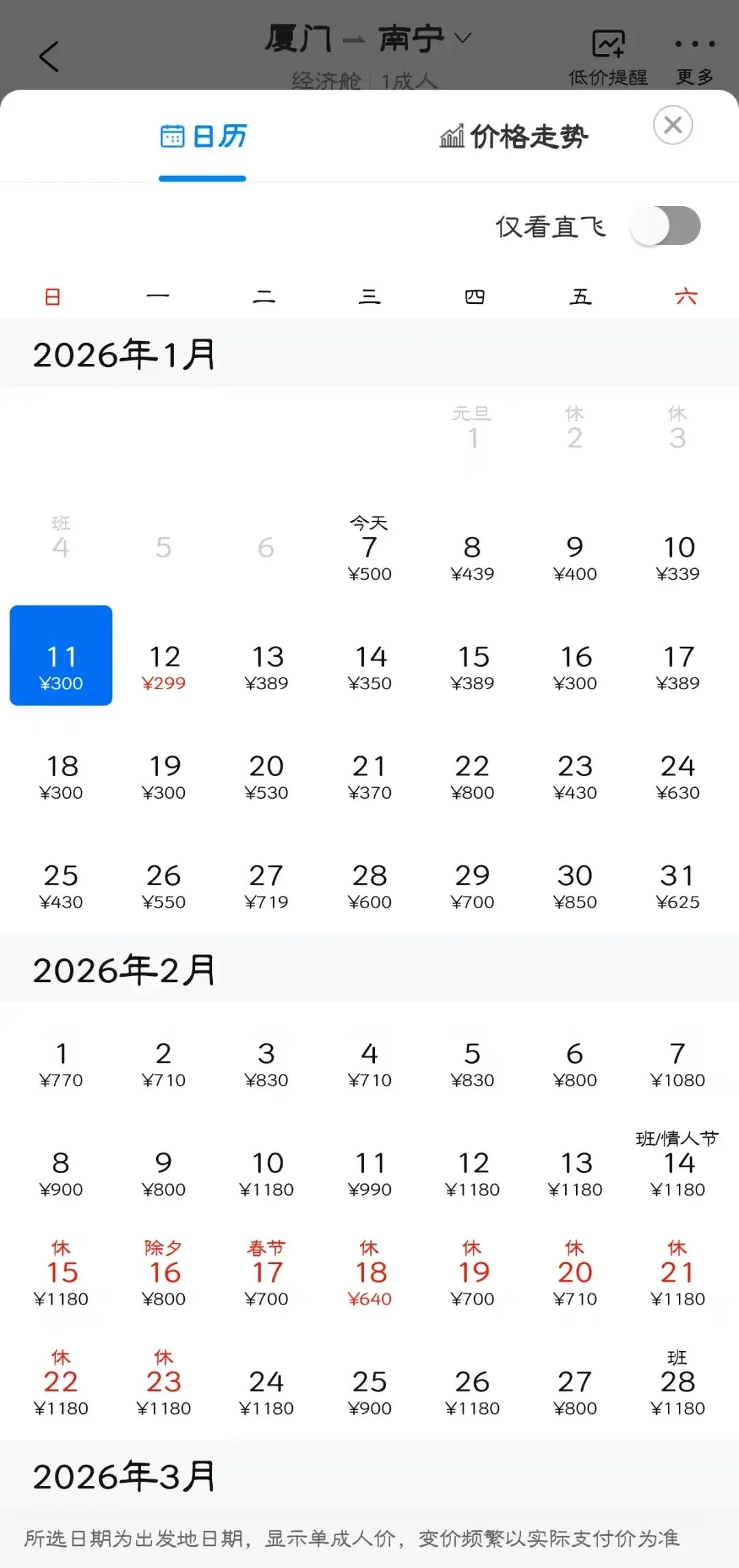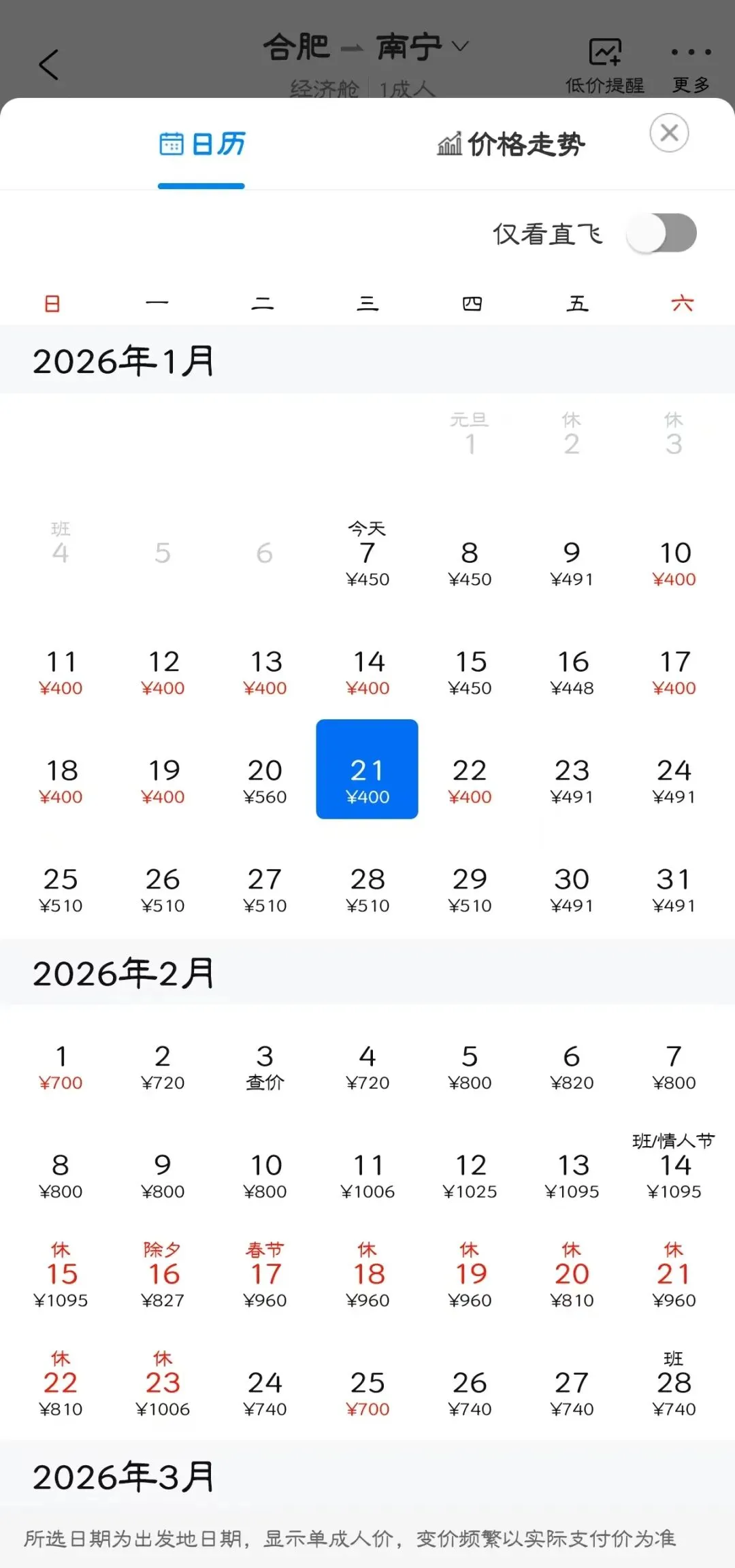 👉“去程最低价/返程最低价”指的是1月特价机票价格,即1月7日-1月31日期间特价机票。