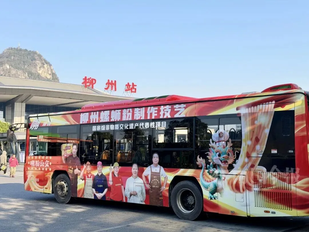 这是柳州投控集团恒达巴士公司与柳州市文化广电和旅游局联合打造的2.0升级版“嗍粉公交”,以全新视觉形象亮相,成为传播柳州螺蛳粉文化、服务市民游客的“移动文化体验站”。