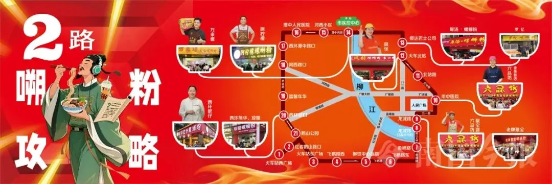 专线最大的亮点在于全面升级的“嗍粉导览”功能。线路示意图不再只是站名排列,而是化身为一幅“柳州螺蛳粉美食人文地图”。