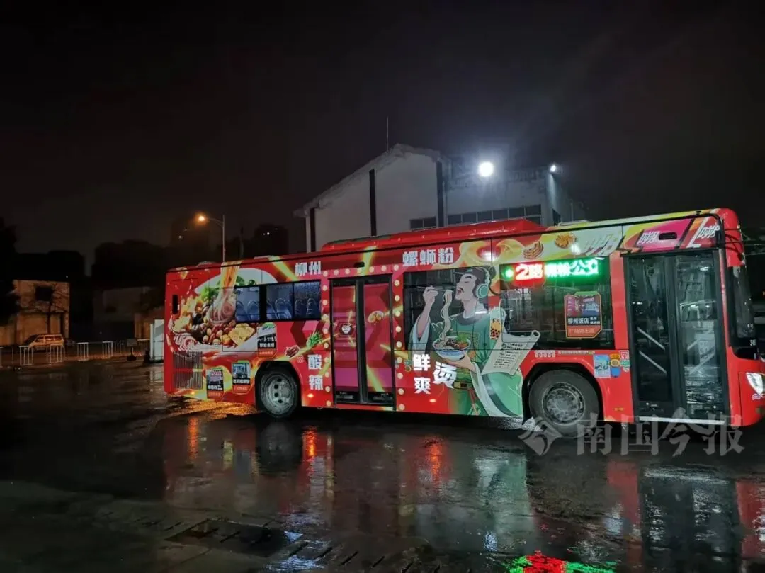 此次升级的“嗍粉公交”,采用高反光环保材质全景包装,车身在日光与夜色中皆熠熠生辉,“嗍粉公交”字样与生动可爱的螺蛳粉主题插画引人注目。