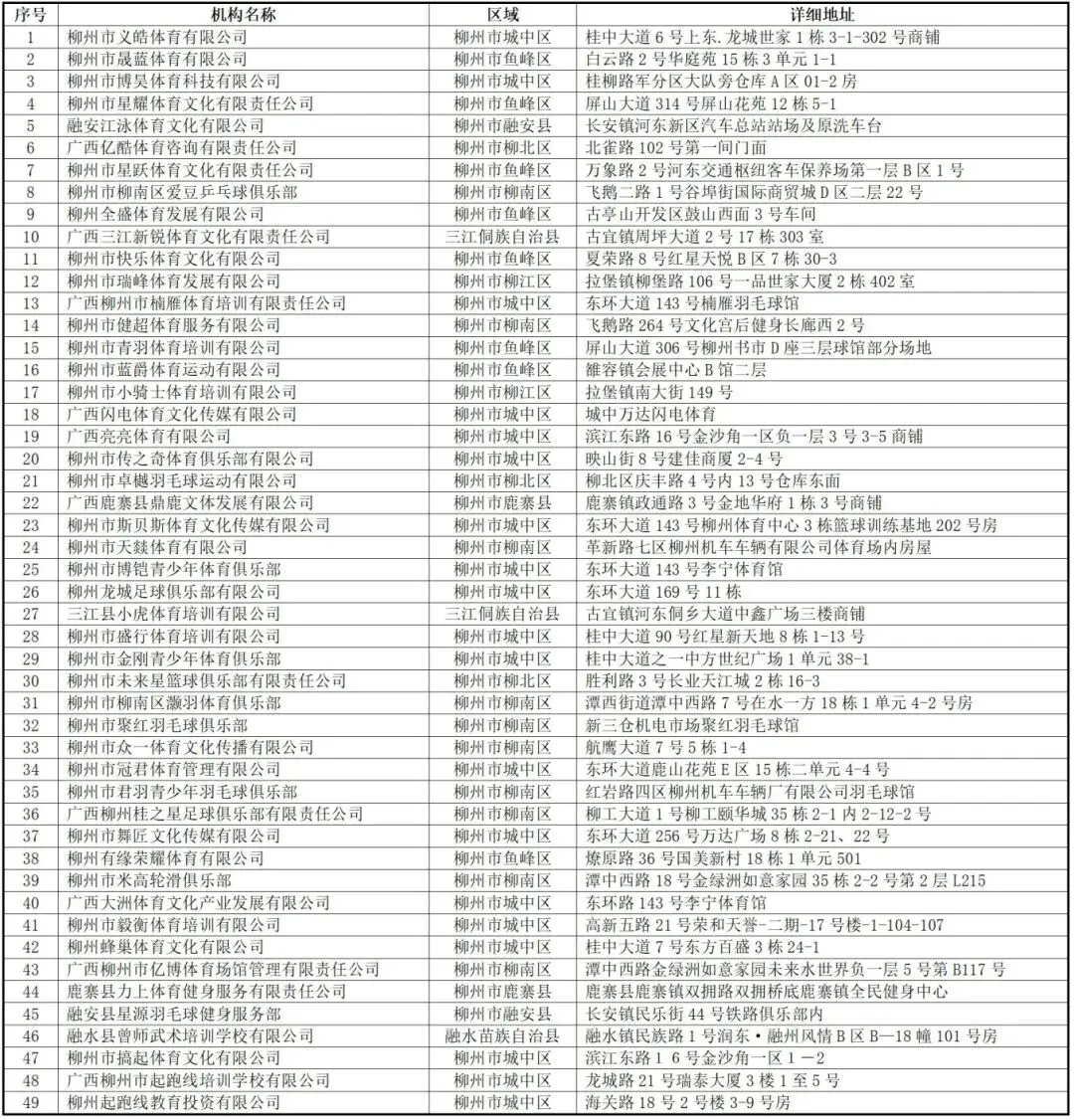 根据全国校外教育培训监管与服务综合平台数据信息、有关监管部门检查核查等情况,经征求各县区体育行政主管部门意见,现将柳州市2026年第一次体育类校外培训机构白名单汇总公布如下: