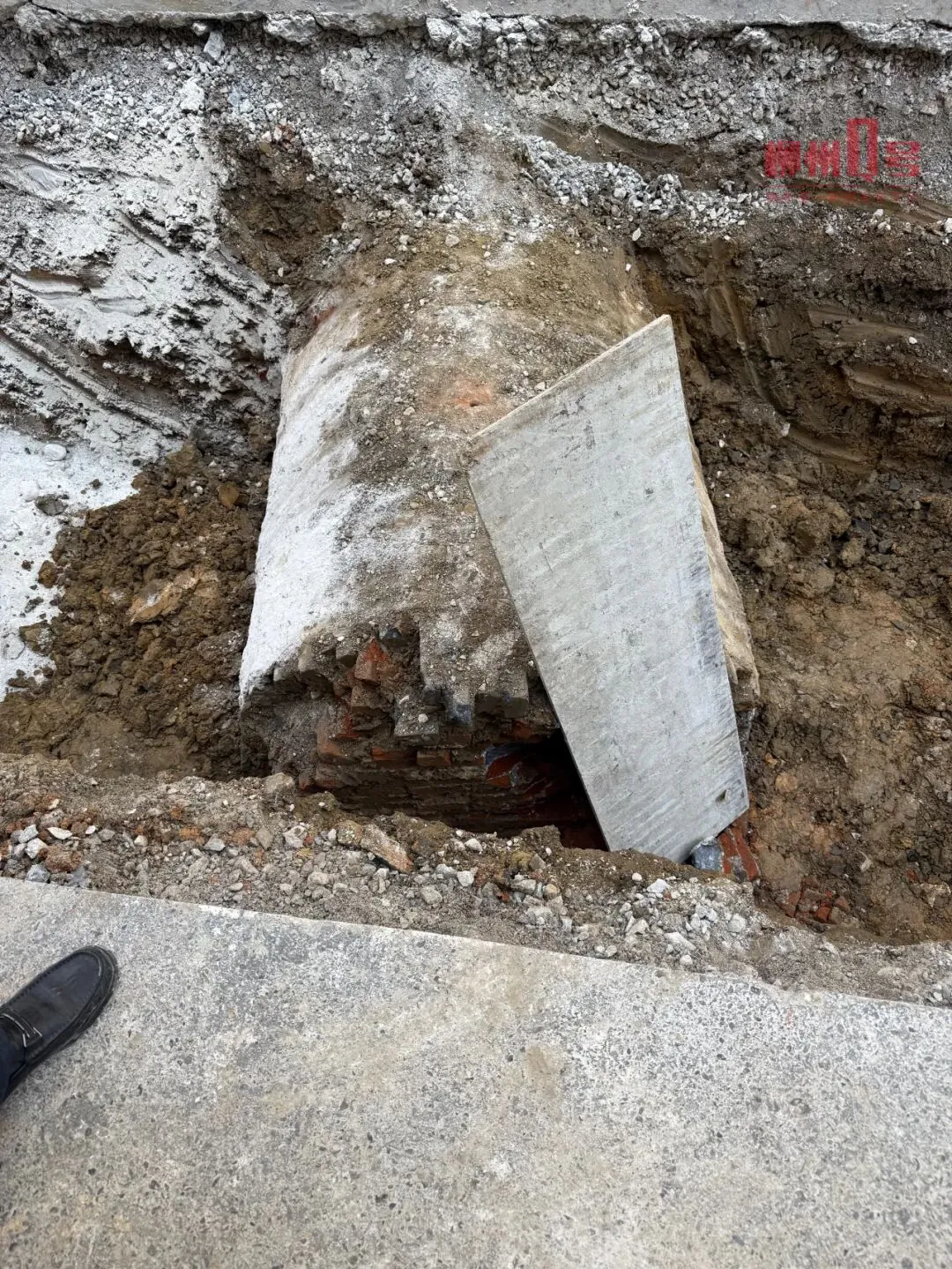 然而,在白色排水管前方,一个柱状建筑物横亘在沟槽中,挡住了排水管的延伸方向,柱体一端露出大部分红砖。