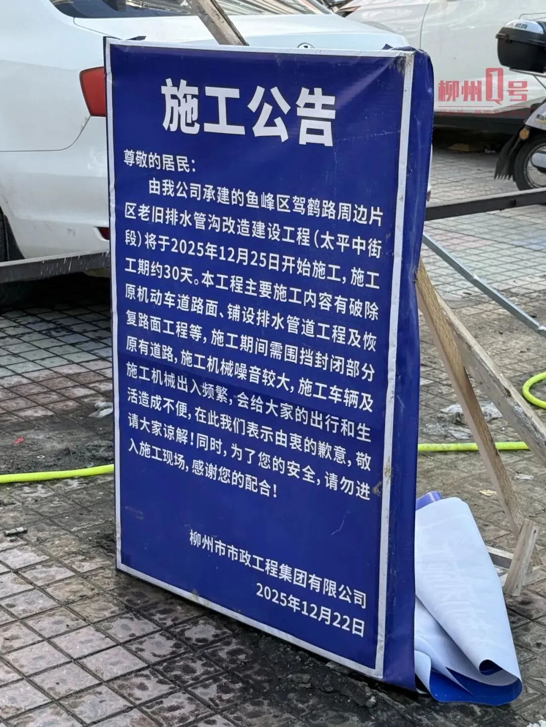 当日11时,记者抵达该路段看到,此处正处于施工阶段。附近张贴的施工公告显示,该路段正在进行老旧排水管改造建设工程(太平中街段)。往施工深处走去,可见路段中央被围挡封闭,围挡内侧的中央路段已被破开,露出下方的泥土和石块,形成一个长条的沟槽。在沟槽里,一根白色排水管已铺设。