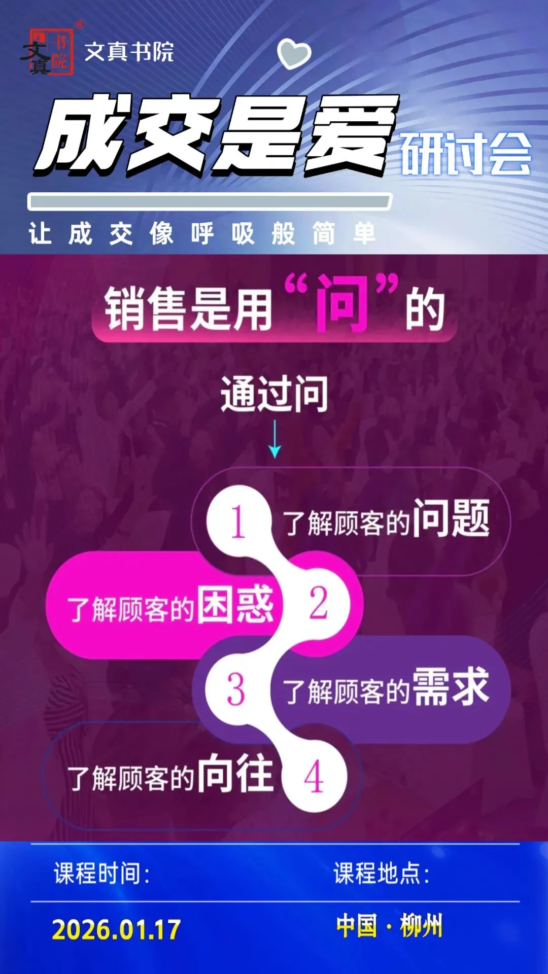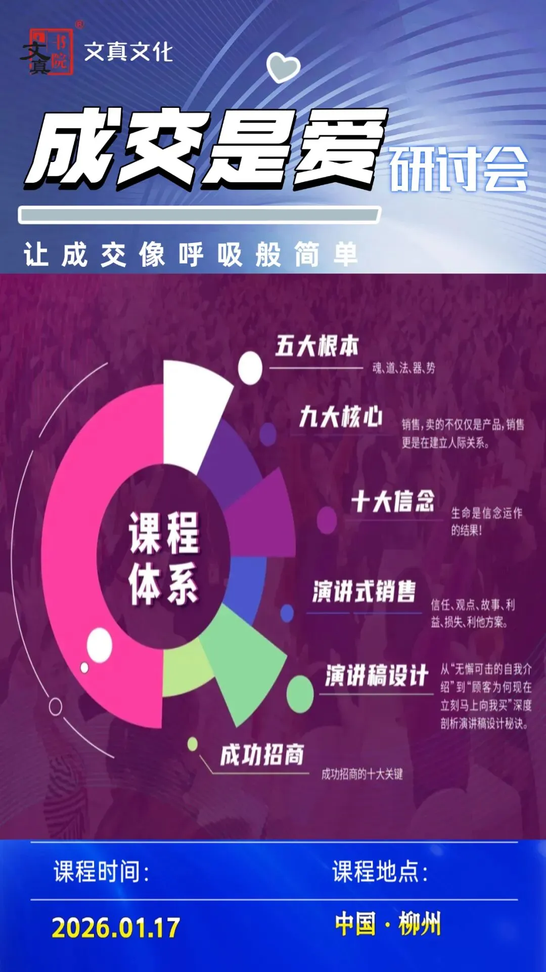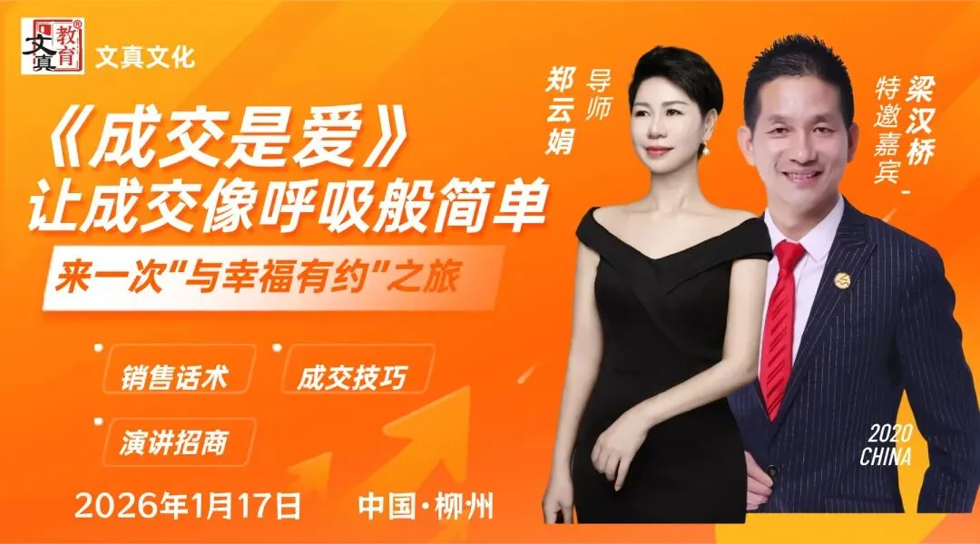 为了让更多的人掌握销售的内在真谛,我们特别推出王牌课程《成交是爱》。这不仅是一场关于销售技巧的分享,更是一场关于如何通过发自内心的爱去成就他人、成就自己的心灵洗礼,集于道、法、术、器、势相结合的一堂助力你事业快速发展的必修课。