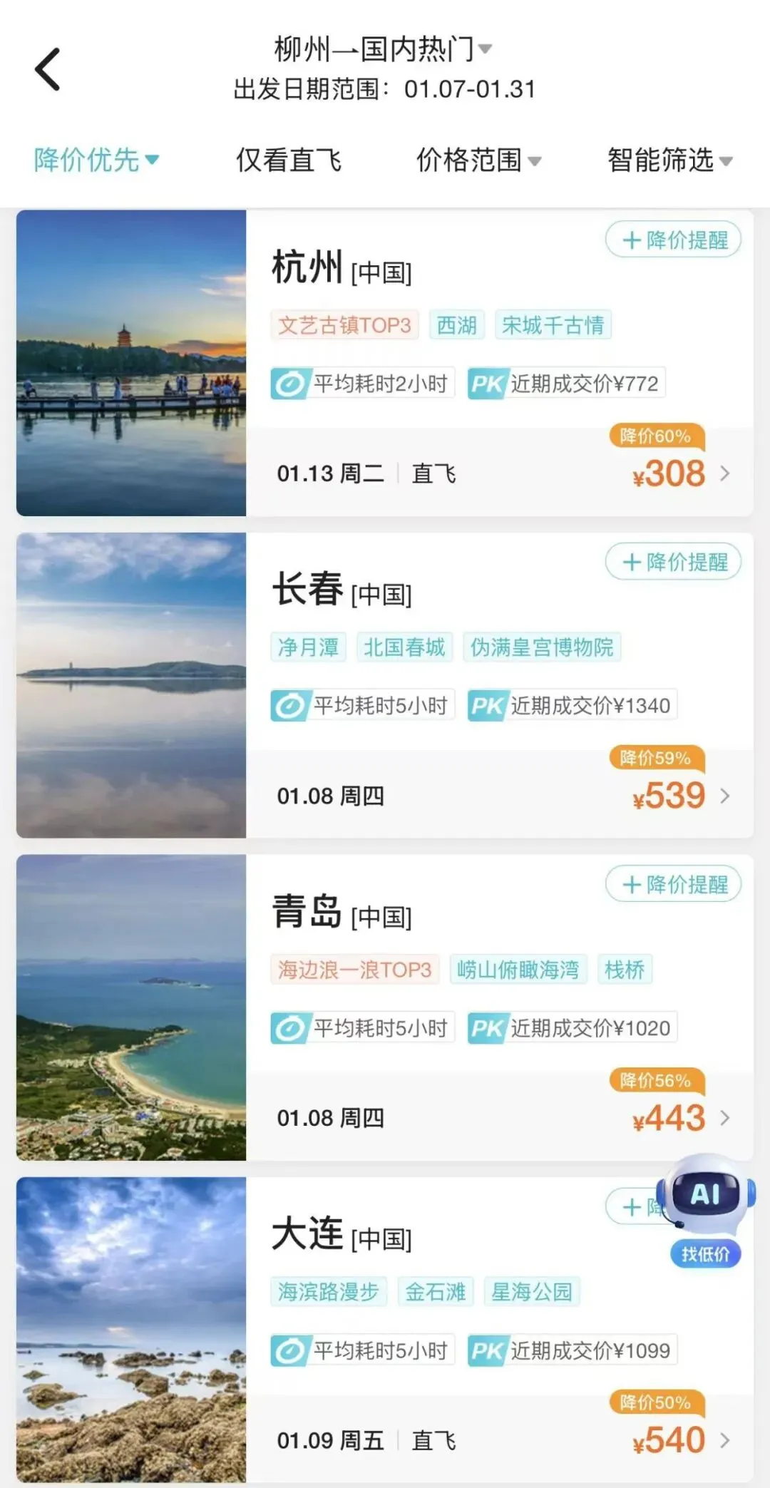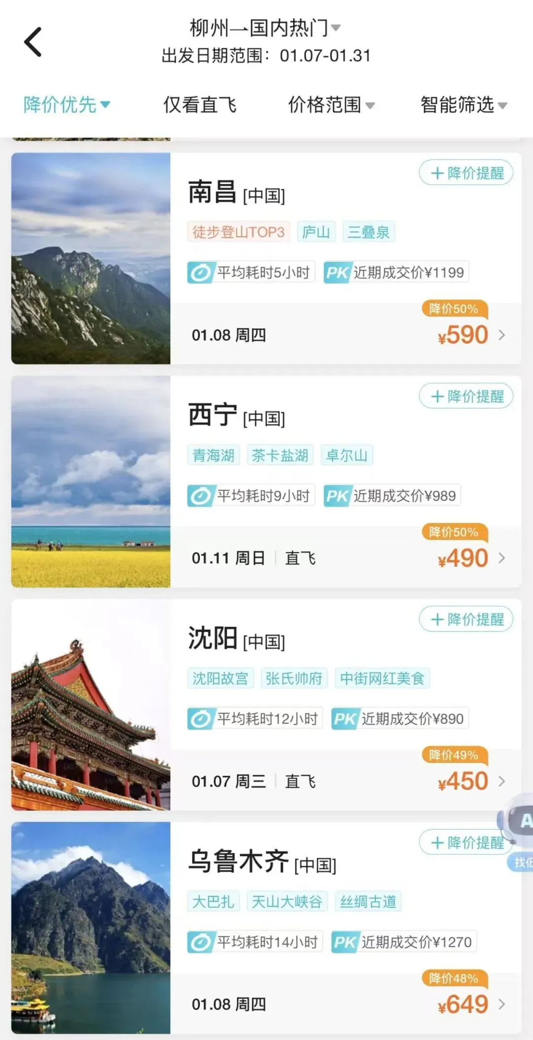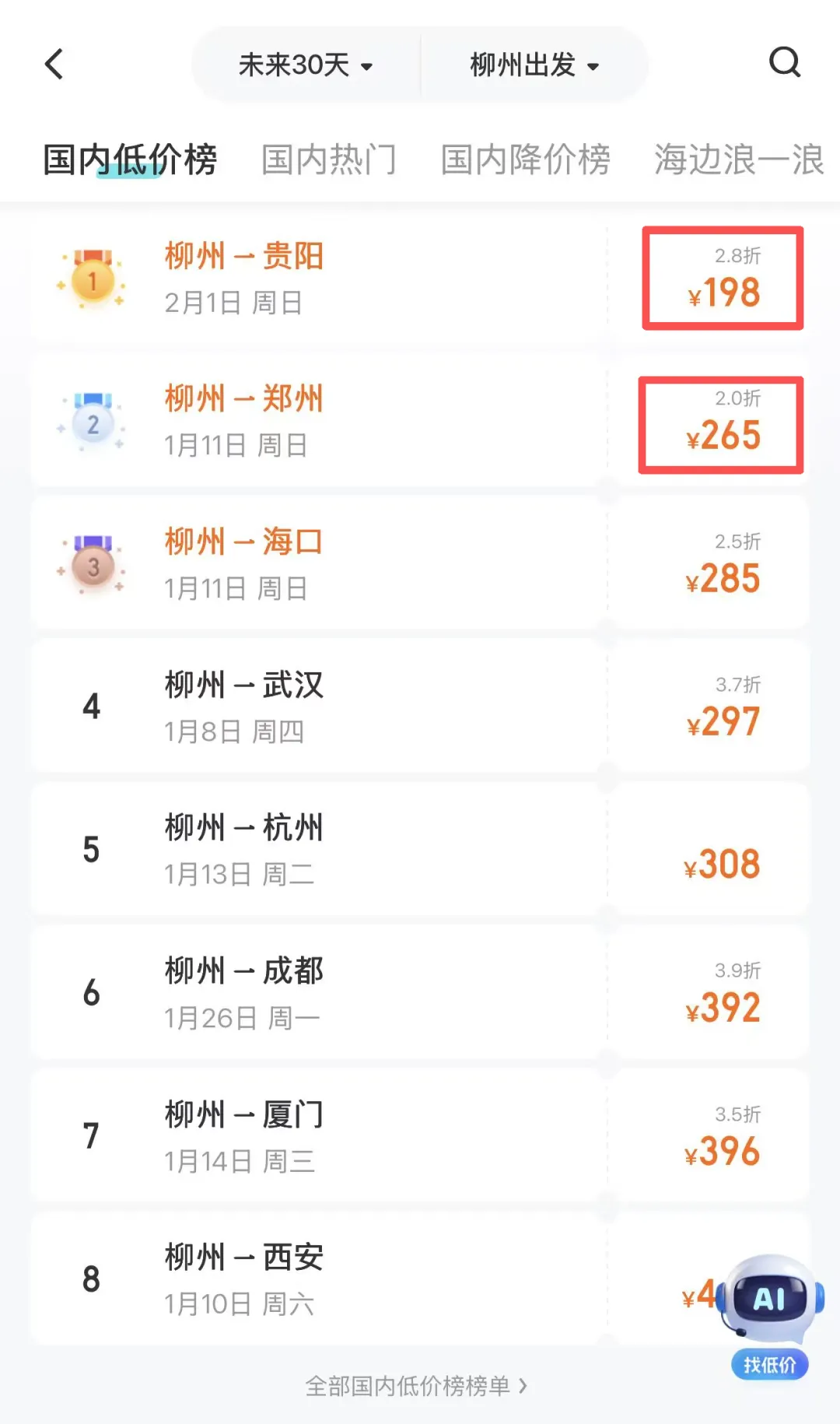 小编通过第三方售票APP查询近期从柳州出发去往多个城市的机票都出现了不同程度的打折