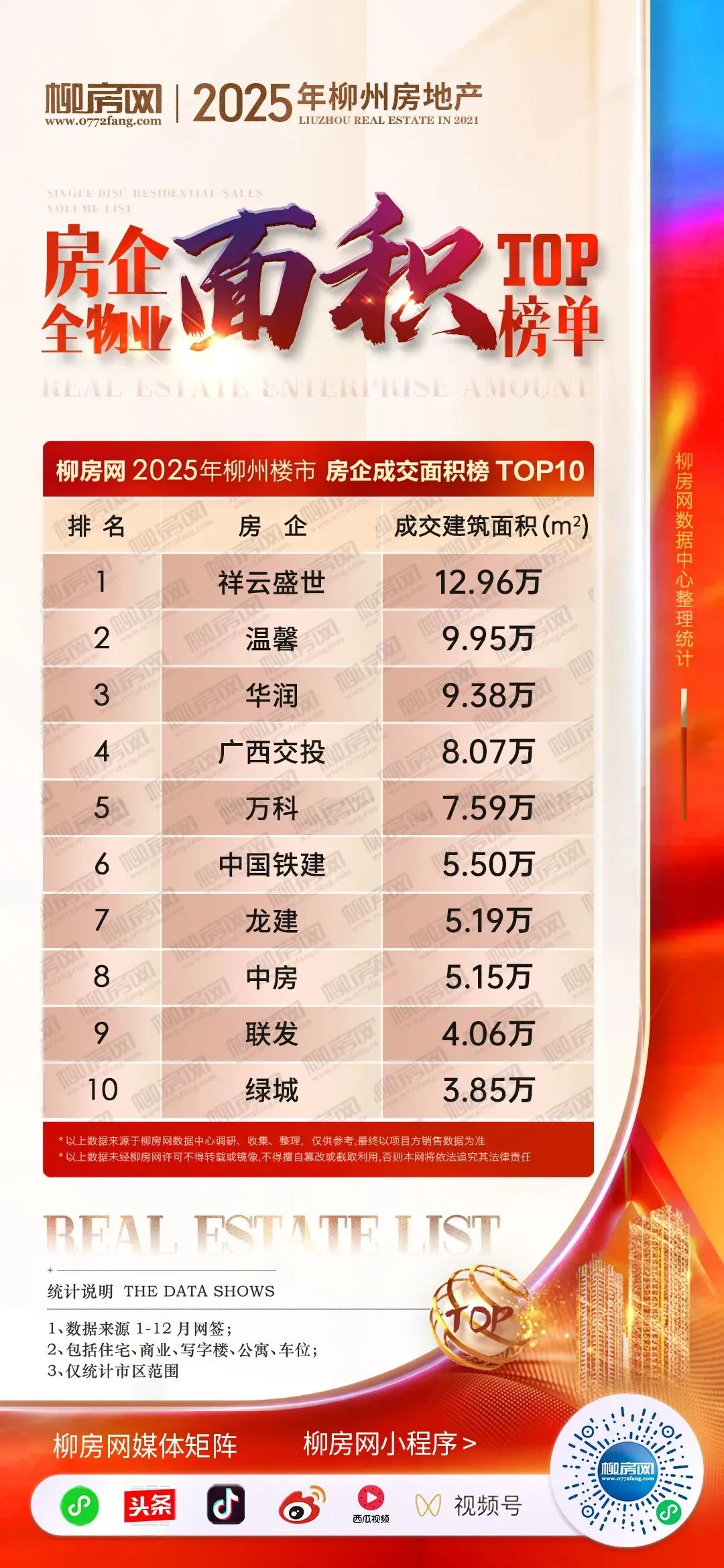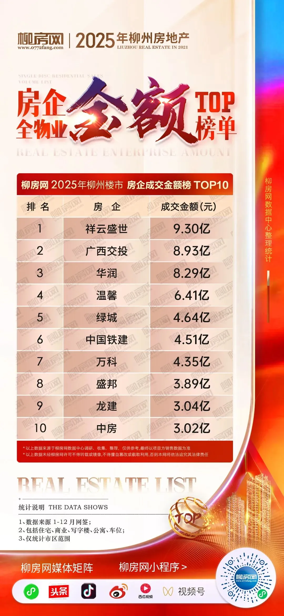 2025年,柳州祥云盛世地产以12.96万㎡、9.3亿的总成绩揽下房企榜双料冠军。广西交投地产8.93亿位居金额榜亚军、温馨地产以9.95万㎡的销售成绩位于面积榜亚军;华润则以9.38万㎡、8.29亿元的成绩揽下双榜季军。